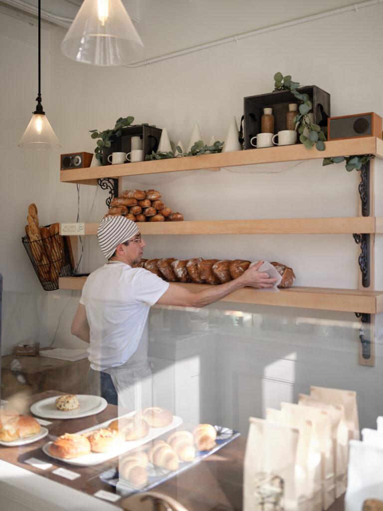When Zu Bakery in Portland’s West End opens at 9 a.m., it’s the pastries, warm from the oven, that are laid out first. By 11, says baker and owner Barak Olins, the pastries should be sold out, and in their place will be warm breads, which are replaced by pizza in the afternoon. As each new item comes out, the goods on the counter shift down toward the register. By the end of a day, 5 p.m., all that’s left are the wines that compose the wine station and the empty Softset Ceramics serving trays, made by Barak’s wife, Mimi.