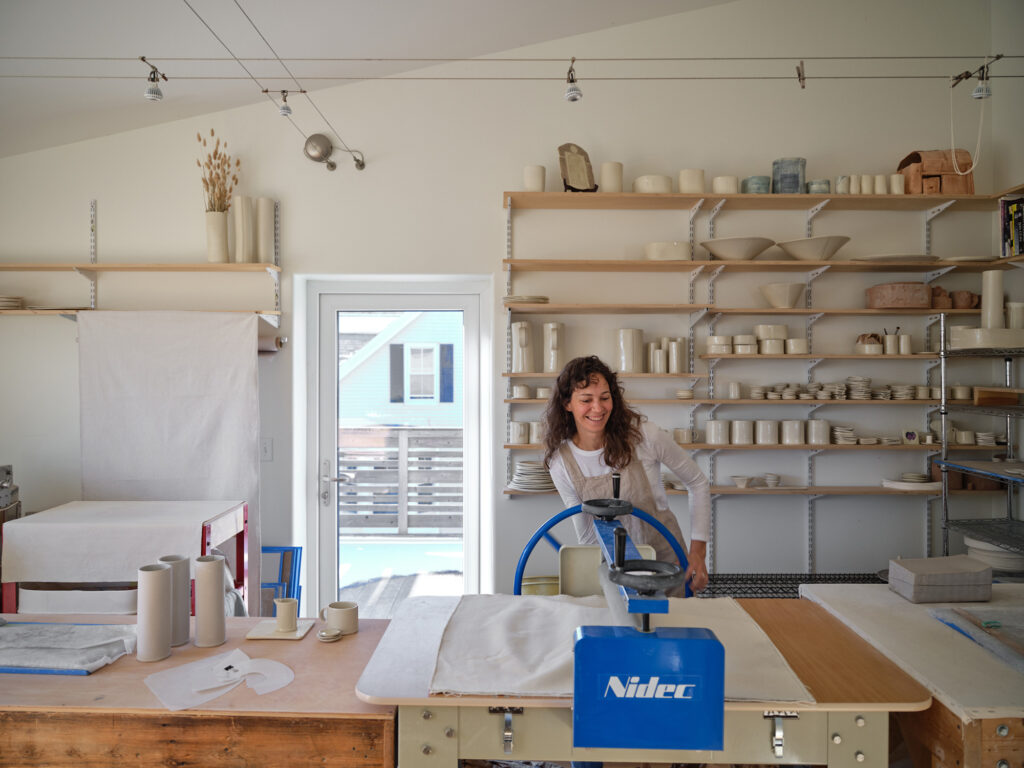 On the third floor is Mimi’s studio, where light pours in through a picture window and a sliding glass door leads to a deck. After a sabbatical from Waynflete in 2019, where she taught art with an emphasis on pottery, Mimi began building a body of work that would become Softset. In 2020 she chose not to return to teaching and to remain in the studio in order to focus on ceramics full-time. Recently she was commissioned by the owners of one of Portland’s newest and most talked-about restaurants, Twelve, to create a line of dish ware—over 400 pieces. The shelves of her third-floor studio are stacked with ceramics. A kiln rests in the corner. Three tables fill the center of the room, where Mimi works slabs into vases, bowls, cups, and trays.