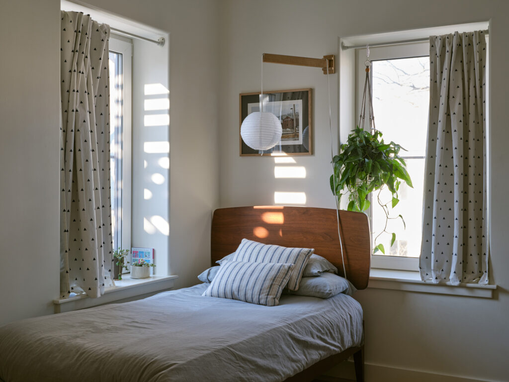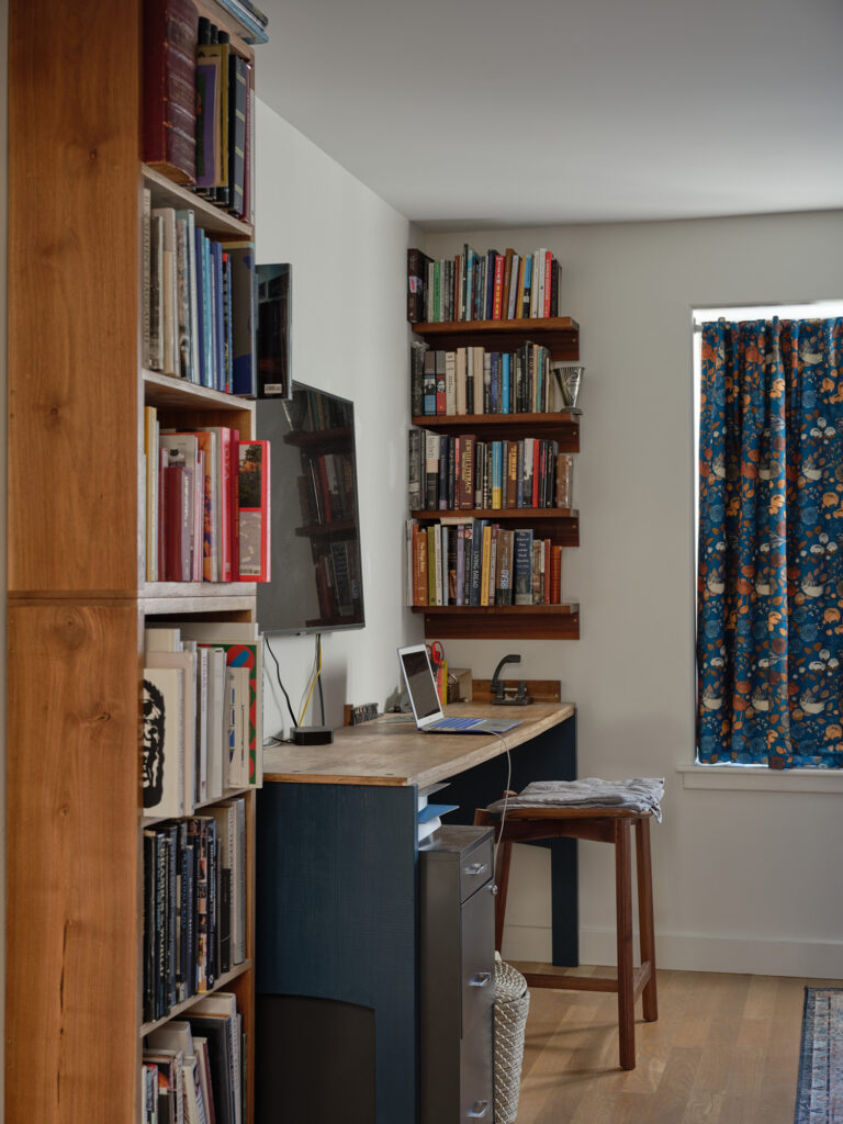 Their bedroom, just off the studio, features 14-foot-tall ceilings that seem to expand the footprint of the relatively modest space, and a long slender window pulls in more light. From the exterior, the window aligns with the front door. That was Chris, the architect, says Mimi, who used the windows as a way of “developing a form.” Christopher Briley, a founding partner of Briburn architecture firm and a passive house consultant, worked from a design initially conceived by Mimi and Barak (the latter studied architecture as an undergrad). Briley also guided the couple through the choices necessary to build a house that uses electricity only. Beyond what’s pulled in by the city grid, the house doesn’t use fossil fuels. It’s heated by mini-splits and a wood pellet stove. The double-framed walls are filled with blown-in cellulose—old newspaper treated and compacted so no “critters” can get in, says Barak. The extra-thick walls increase the R-value: in the summer, the interior stays cooler, and in winter, it’s warmer.
