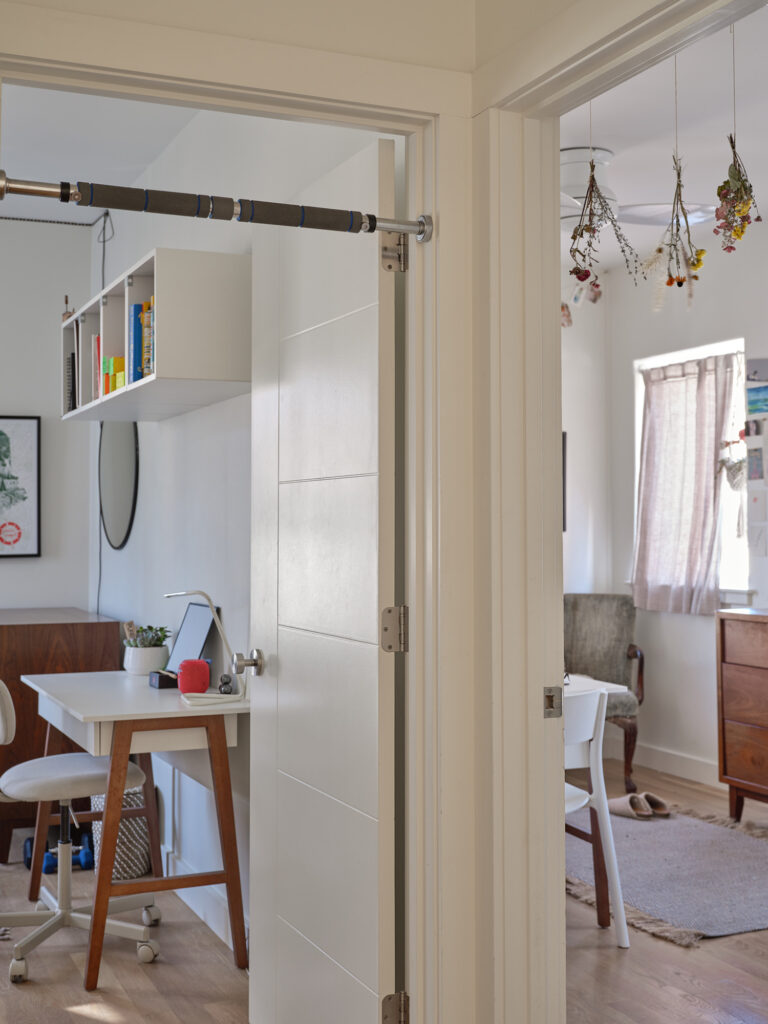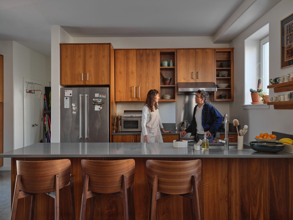 Function informed the design of the house that the Olinses built, too. The three-story just a few streets away from the bakery has a modern exterior. It’s square and tall, with a sloping roof. The inside is spacious, with high ceilings and wide windows. They wanted “clean, cleanable, and uncluttered,” says Mimi. The ground floor is an open blend of kitchen, mudroom, and sitting room that, in the warmer months, extends into the backyard through a wall of triple-pane sliders connected at the corner by one nearly floor-to-ceiling window. The wall of glass was a splurge. Otherwise, their choices were economical, energy efficient, and adherent to the requirements of LEED certification (without going for the actual certification, which is expensive and would matter more to them if they were hoping to sell).
