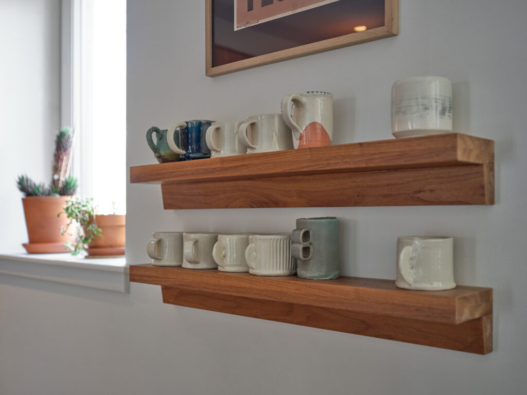 “We didn’t bring a designer in to fill it with fashionable furniture,” says Mimi. They wanted to see what the space needed. Ten years later, the tone they’ve set is comfortable and livable, clean but engaged—there’s evidence that a family lives here. The dogs, Clover and Kipper, sleep in woven baskets near the ground-floor sliders. Sheepskin rugs hang from chair backs and rest on the couches (“I have a sheepie problem,” says Mimi). Over the couch, two prints show the accoutrements of Le Cafe and Le Pain, respectively. Mimi’s ceramics from various eras line the kitchen counter. Recently, the couple purchased a large, dark-wood bookcase for the living room. It’s an evolving space, and the house, like the bakery and even the short walk between the two, reflects the couple’s consideration of how lives are more about movement and process than they are about the containers necessary for the things we collect while living them.