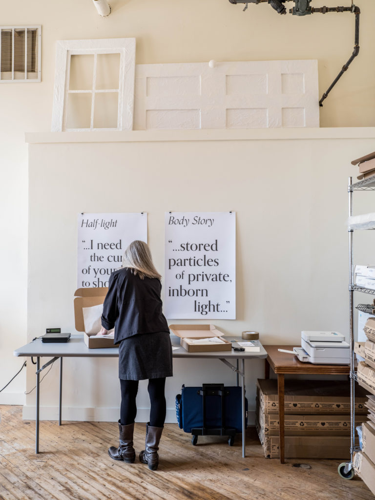 Fisher guides me through the studio, where she keeps a purposely small inventory of her clothing line to prevent unnecessary waste. A rack of samples holds versions of the 12 garments currently in Fisher’s repertoire, and she tells me about the poem behind each one. The composition that kicked off her entire collection is called “Half-Light,” which draws on shadow imagery to comment on how humans impact each other’s lives in both obvious and subtle ways. The top inspired by the poem reflects this sentiment with a semi-hidden panel in the back that depicts two overlapping silhouettes hand-painted by Fisher. Near the start of her poetry career, Fisher attended an event in Brooklyn, New York, called Universe In Verse, a yearly evening of poetry with over 1,000 people. In planning out the logistics of the trip, inspiration struck. “I just had this vision of a blouse,” she says, “that would be split up the back with a sort of curtain, and down the spine would be this sexy poem printed there. And, in my self- romanticization, I imagined that somebody would ask me about it, and then we would have a conversation, and I would have an interesting connection in the city.” Much like her poems taking on physical form through garments, when she returned from the trip, the idea for Catherine Fisher Clothing began to materialize.
