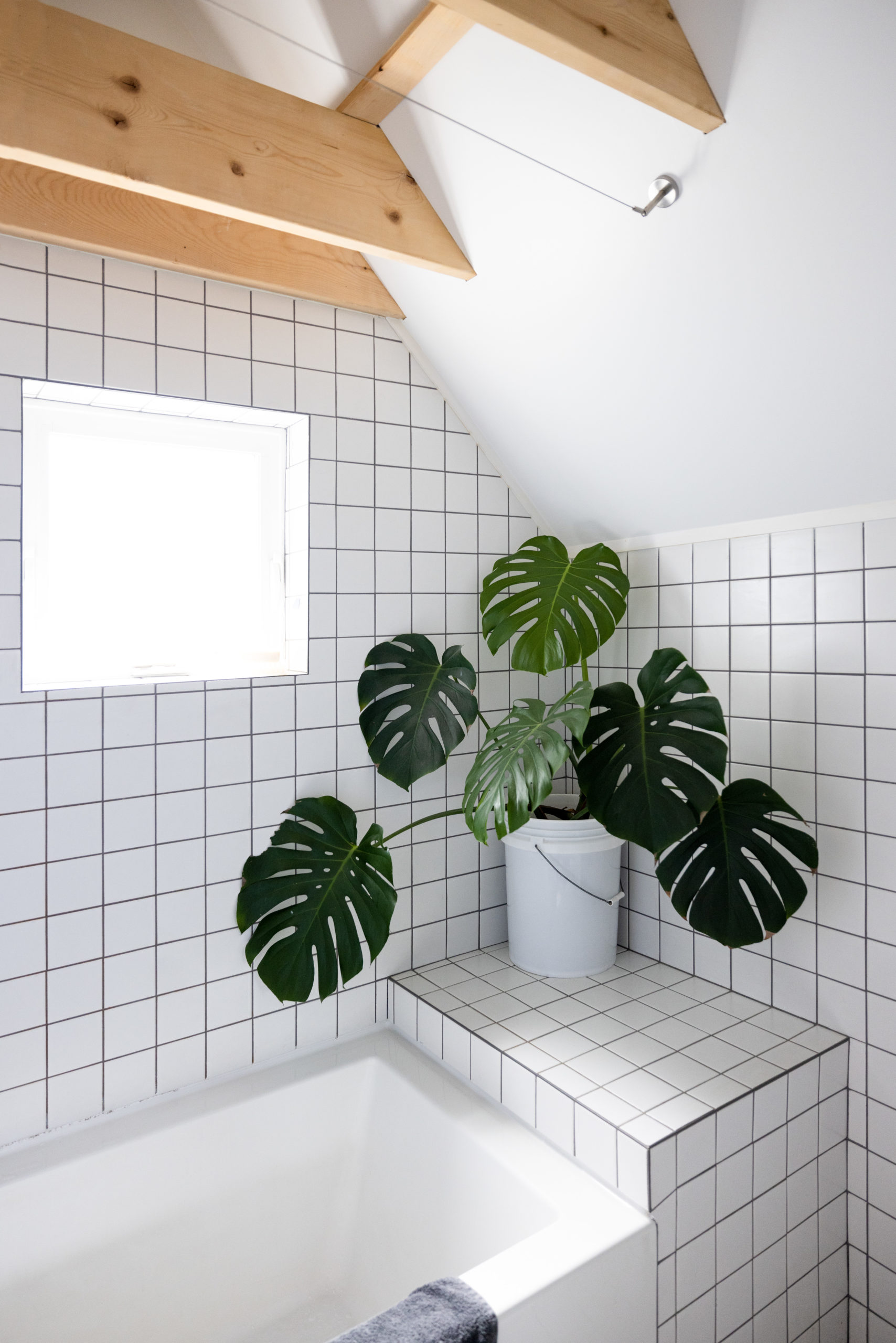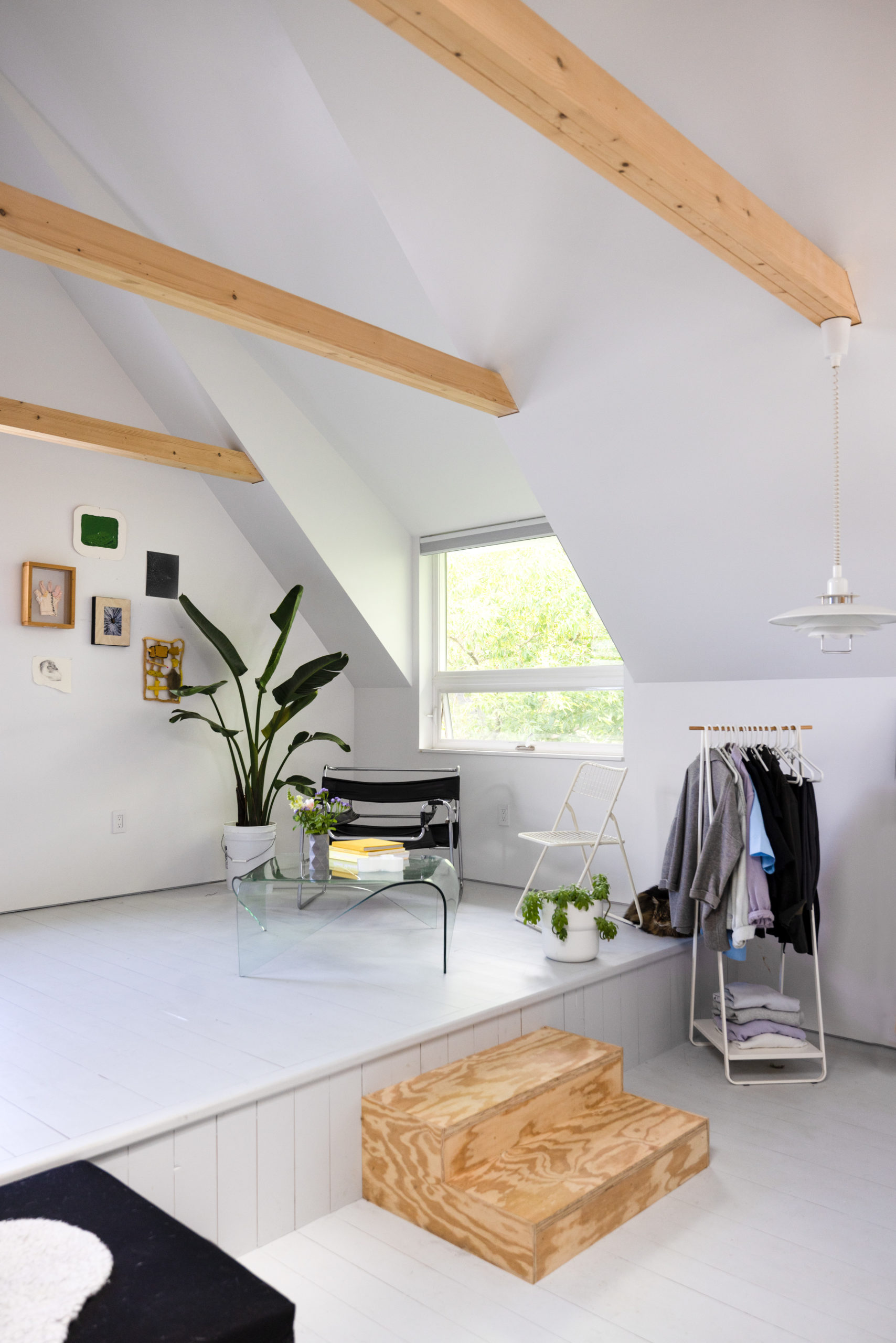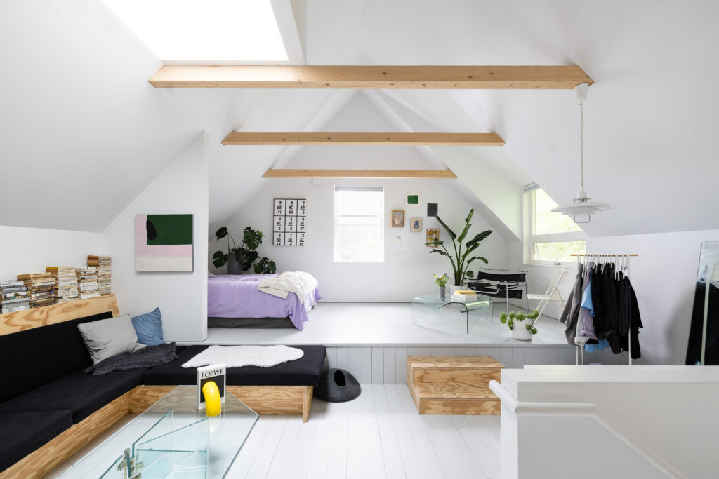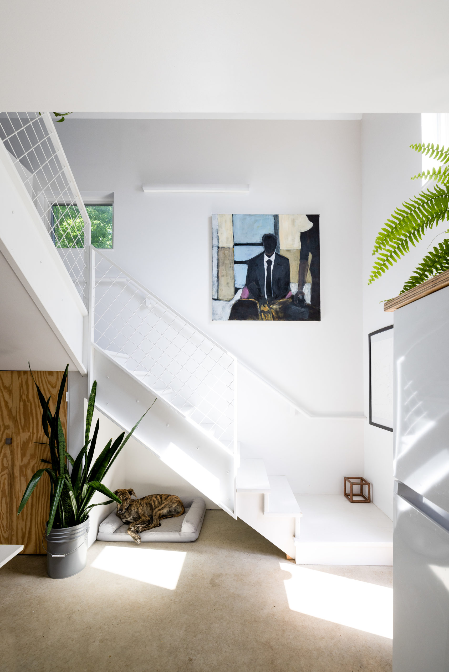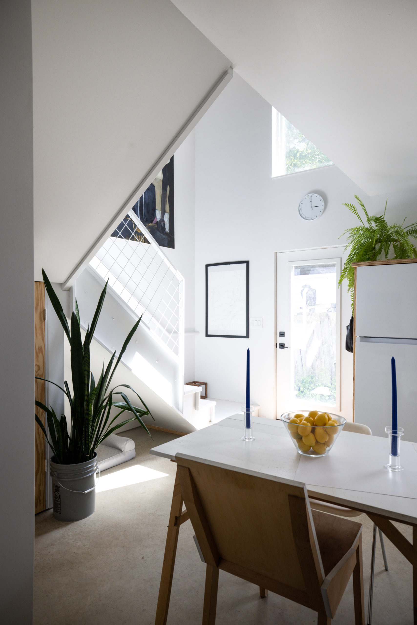As in Queen’s sculptural practice, material specificity is the dominant factor in her home. The exterior, which has no street-facing windows but lets in abundant light from all other directions, is clad in pale metal, emphasizing its Modernist geometry and mirroring the landscape-focused geometric aesthetic of the Haystack Mountain School of Crafts campus in Deer Isle. Inside, a glass door leads to the bright kitchen, which in turn opens into the artist’s studio. Translucent glass doors can close the kitchen and studio off from one another when more division is needed, and a sliding garage door to the backyard converts the studio into a semi-outdoor space in warmer months. The studio is lit with rosy, nebulous light from LEDs hidden in the slats of the wooden ceiling; the walls feature a recessed space at floor level in the place of trim board, visually lifting the height and emphasizing the gallery-like nature of the space. Cement floors are heated with hot water, which is the home’s only heat source, utilizing a heat recovery system for air exchange. Up a set of stairs (featuring a grid railing that echoes the grid-like tile in the quasi-futurist bathroom) is a living area with a step up to a sleeping area, and, accessible via a small ladder, an additional nook that looks out from below the high, peaked ceiling. Bright white walls move light through the space, filtering it from large windows and a tunnel-like skylight, which contains LEDs that continue its illumination at night. The natural linear wood patterns of the plywood are visible, and large, lush houseplants break up the regularity of the lines. “I like to shift the material, repeat it, and repeat it again,” Queen says.