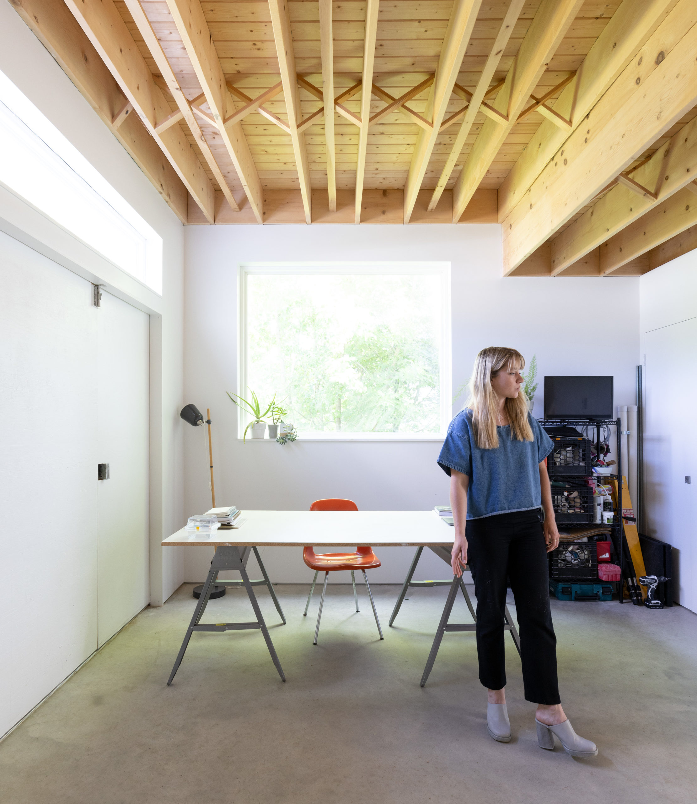 Architect Dimitri Brand echoes Queen’s perceptive relationship to materials. “The house was conceived as orbiting around art making, with three primary goals: to be adaptable, minimal, and livable,” he says. “The space allows the art and objects in it to be the foreground, while also utilizing nonprecious materials that allow the house to be lived in.” Another important consideration in the home’s construction was affordability and sustainability. “As an all-electric house, it takes advantage of the fact that 79 percent of Maine’s electric generation comes from renewable sources and will only continue to get greener as the overall grid does,” says Brand.