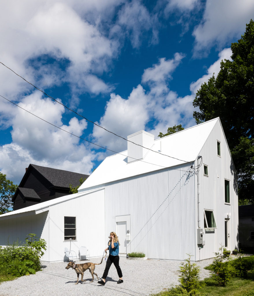 Rockland’s North End, a few blocks up from the ocean, is a neighborhood of shady trees, meandering gardens, and beautiful, idiosyncratic older houses. Nestled among these are a few remarkable examples of contemporary architecture, including artist and curator Anna Queen’s home and studio, which was completed in late 2020. The site once contained a structurally unsound antique house that held promise as a platform for something remarkable. “I wanted a space that reflected my work,” Queen says. We are in her pristine kitchen, which at the moment is graced by her two large striped cats, Basil and Dorian, and her slender brindled dog, Ernest. “It was important to me that everything be very minimal, with clean lines, open, and with good light—and having material be at the forefront.”