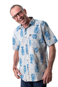 Each one of these 100-percent cotton shirts is a hand-printed, one-of-a-kind wearable work of art. This shirt, sure to become Dad’s new favorite, features a chest pocket and coconut shell buttons and is also available in red.