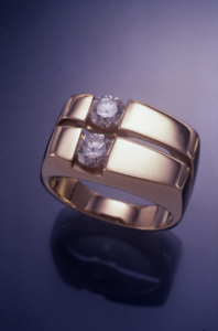 This copyrighted gents ring in 14KT yellow gold is set with two 0.75ct. round brilliant–shaped diamonds. The retail cost varies depending on the diamonds chosen.