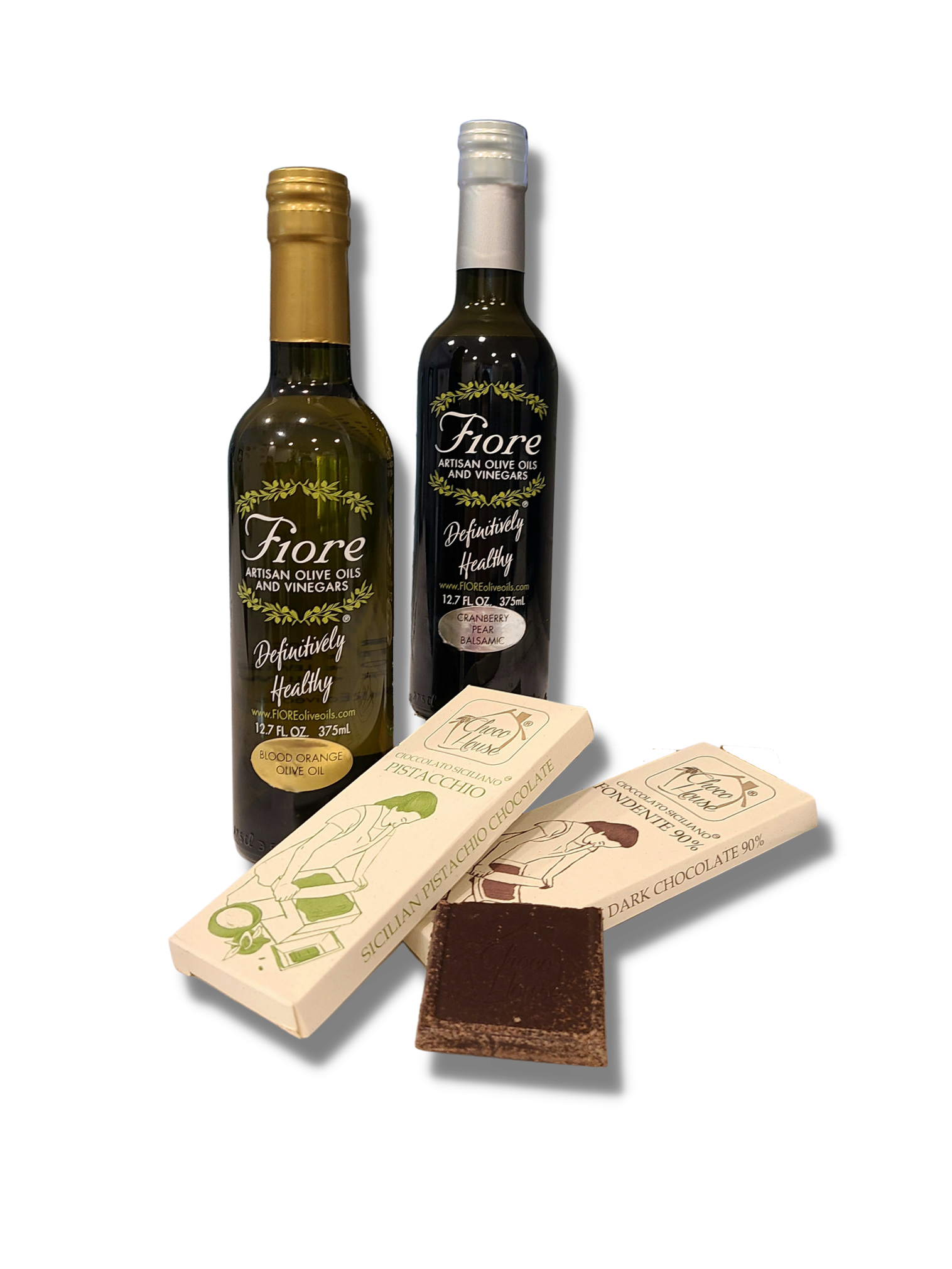 This olive oil and balsamic vinegar is a delightful pairing for salads and fruits, and the balsamic can even be stirred into seltzer water or adult beverages. Chocolate from Sicily is the icing on the cake—a sure sign of spring!