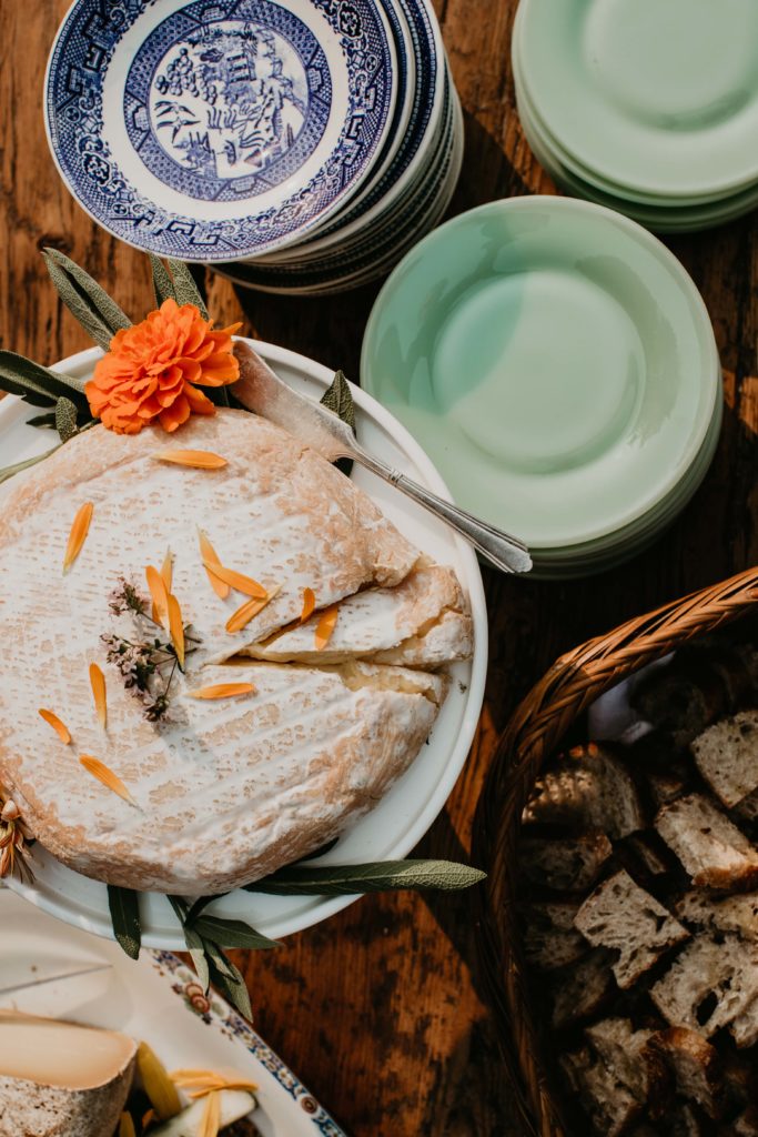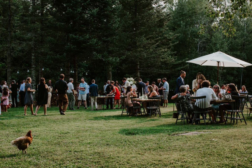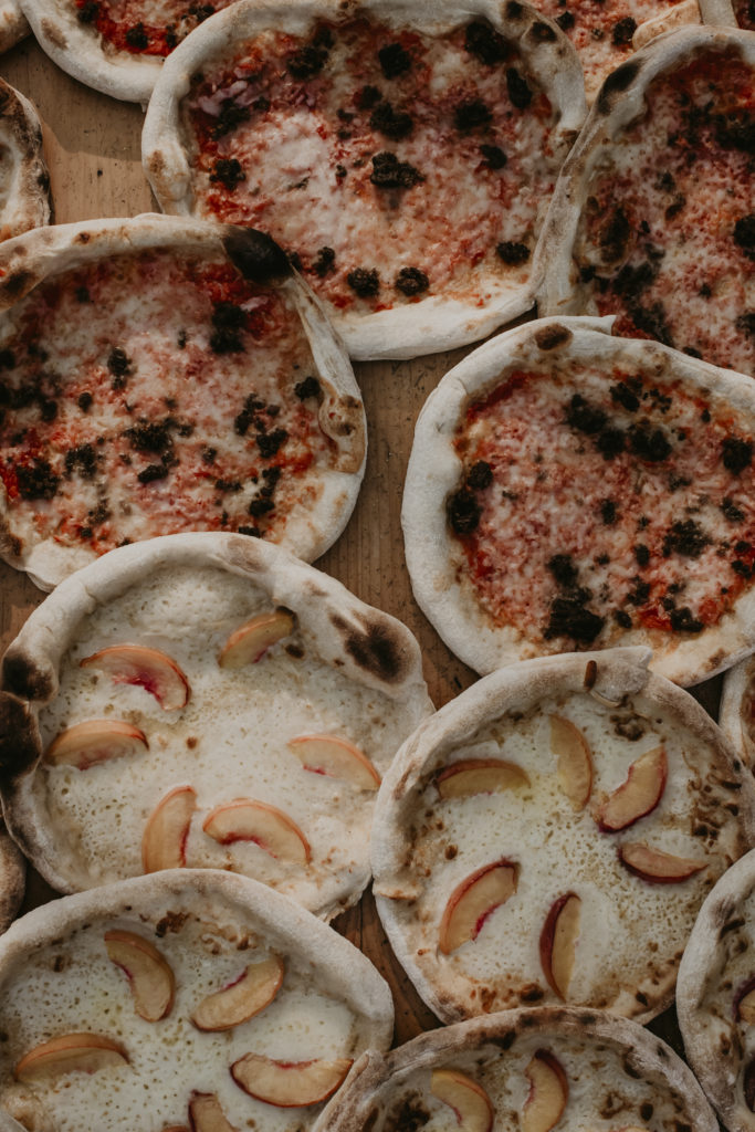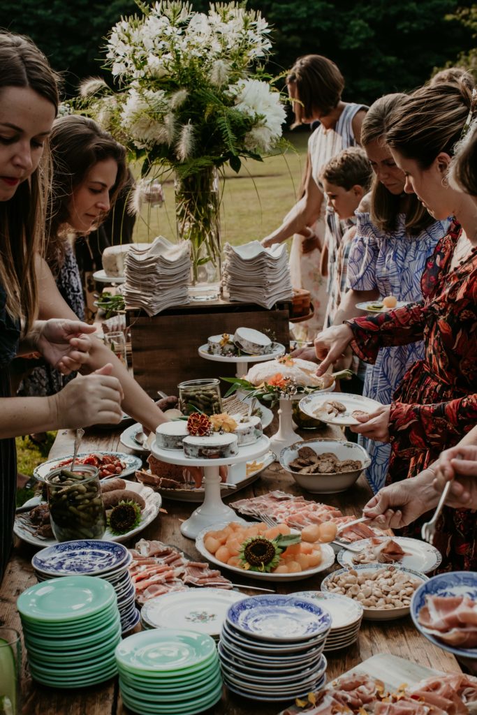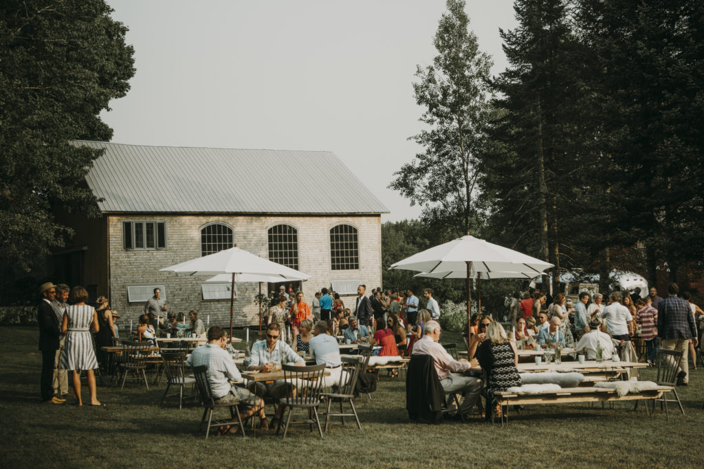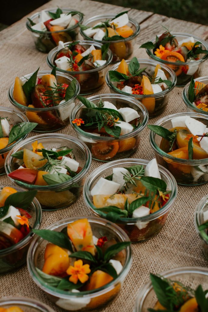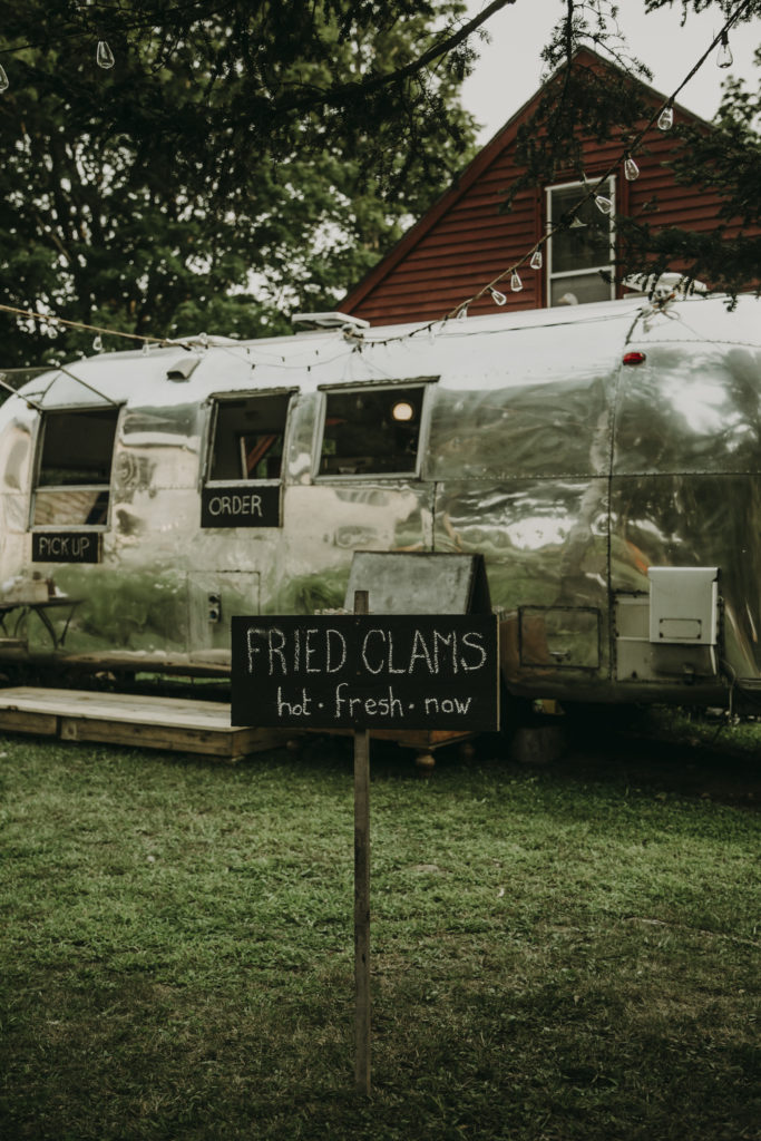 Wooden tables set out on the lawn held John’s River oysters on the half shell, cheeses, charcuterie, bread, and pickles, served on vintage china. Guests also dined on fried Maine clams with frites and coleslaw, served in wooden berry baskets; heirloom tomato salads with mozzarella, basil, and marigolds; and tiny lettuce head salads. Uproot Pie Company’s mobile pizza oven offered a variety of wood-fired pies. In lieu of a cake, there were peach galettes from Tinder Hearth Bakery in Brooksville, and Erin’s Airstream was turned into a dairy bar serving hot fudge sundaes. Drinks included gin and tonics with cucumber and blackberries, nectarine and basil lemonade with Cold River Vodka, Lanson Champagne, and wine from the Corbières region in southern France.