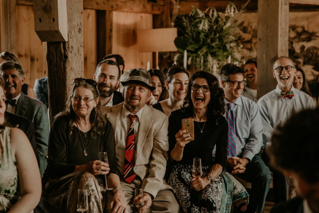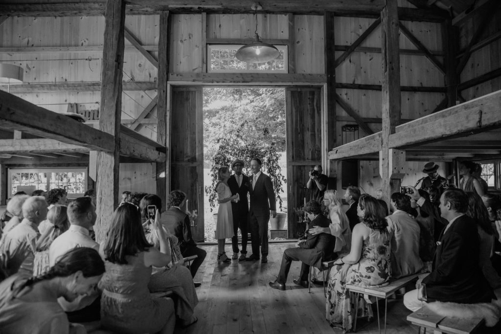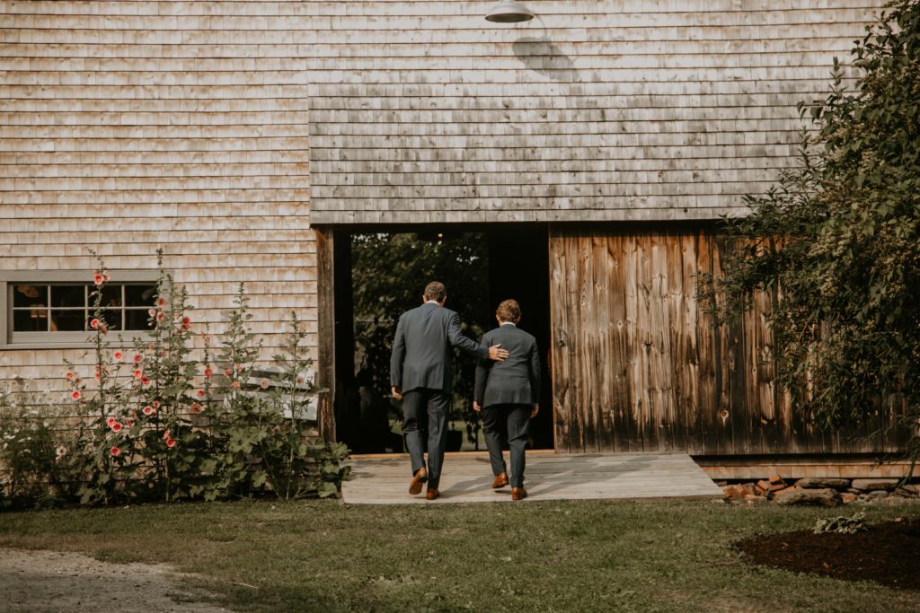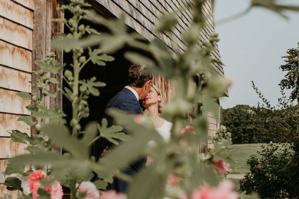 Erin and Michael enlisted friends and family to create a deeply personal celebration. Michael’s dad painted the postcard wedding invitations, which were calligraphed by the couple’s friend, Nancy Buckley. “We had friends help us build out our barn and perennial gardens, and friends helped us build the tables and benches from wood that came from our friend’s land,” says Erin. “Friends grew our flowers, made our rings, sewed our napkins, shucked the oysters, fried the clams, and foraged for ferns and moss in the woods.”