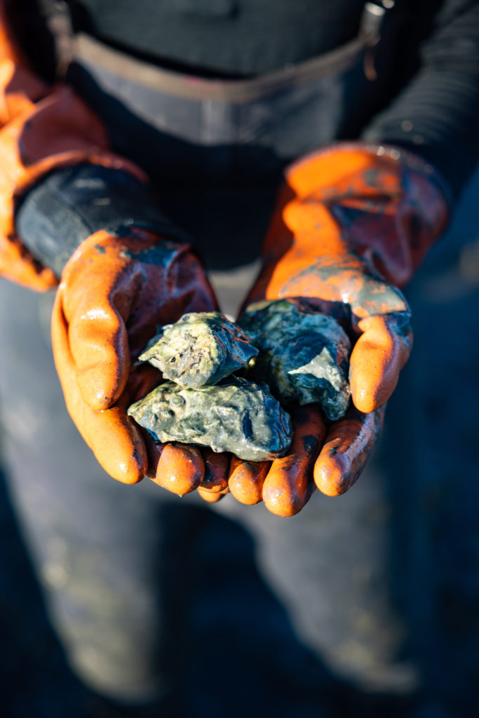 But really, there’s no better reminder of what oyster farm-ing is all about than when I hear Jaegerman tell me that her co-owner, the founder of Wolfe Neck Oyster and Basket Island Oyster, Mark Green, is also a professor of chemical oceanography and environmental science at St. Joseph’s College. Except maybe when you consider the oysters them-selves, sitting there, selflessly pumping nutrients back into the ocean, cleaning our waterways, regrowing their own species and replenishing others, asking only that we do the same in return for our oceans. “The emphasis deserves to be placed on all the great farmers working hard to be stewards of the marine ecosystem,” says Jaegerman, “and to grow the greatest oysters out there, regardless of gender.”