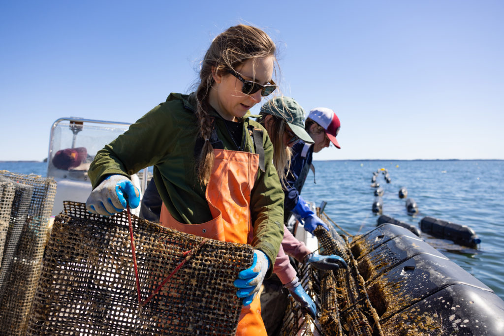 It’s in the low 40s—freezing for April—and the rain is picking up, but Hillevi Jaegerman doesn’t seem to notice. On a fishing boat in a cove on Yarmouth’s Royal River, Jaegerman is in bright orange coveralls—no coat—whipping back one of her braids and manually cranking a big slimy cage out of the water. The winch is broken, but the oysters are ready for harvesting.