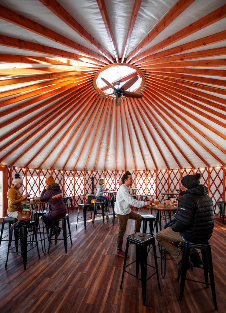 She pours me a Mystic Beauty saison and herself a Reeko pale ale and suggests we head out to the yurt behind the brewery. As we shuffle over the fresh dusting of snow, I’m struck by the hush of the darkened landscape. The brewery is set on 40 acres that abut another 365 acres protected by the Loon Echo Land Trust, leading all the way to the Crooked River, a fabled fly-fishing destination that runs into Sebago Lake.