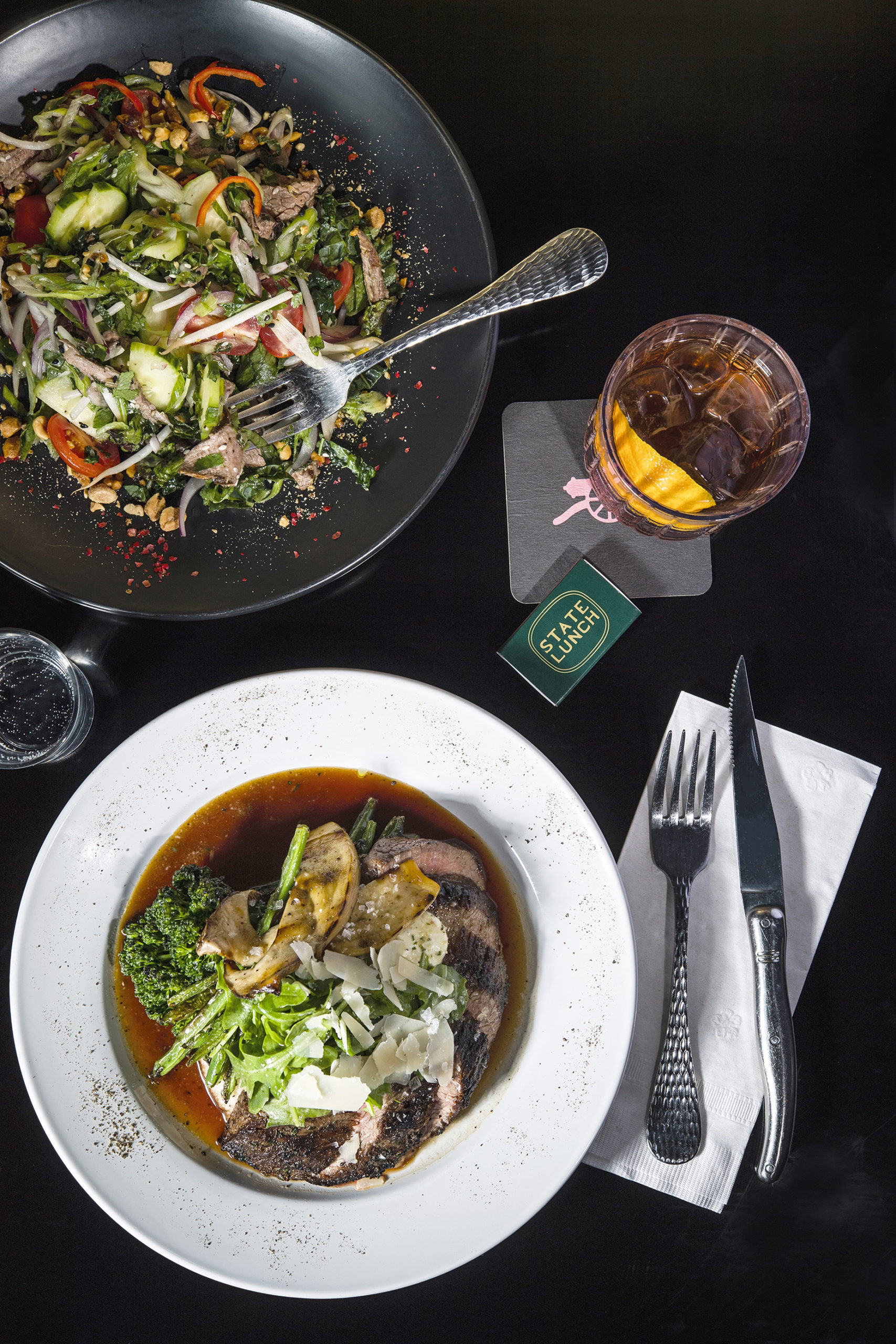 like the Thai steak salad (left) as well as classics like its grilled bistro steak with seasonal sides (right).