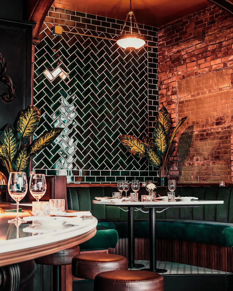 Wendy Polstein of Quill Design drew inspiration from pre-World War I European bistros when designing this glam Old Port eatery with a u-shaped bar, emerald green velvet banquettes, and leather club chairs.