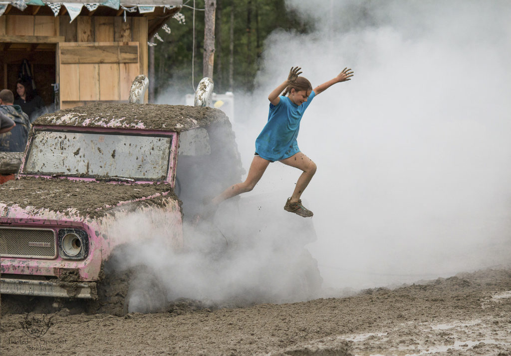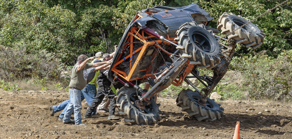 Every June through September, photographer Brooke Adams spends one weekend a month covered in high-visibility gear and a thick layer of mud while huge rigs, frequently made of parts taken piecemeal from other vehicles (think: a Toyota Tacoma body with the engine of a Chevrolet) roar past her, sometimes mere feet away. “I’ve gotten really good at timing the wave of mud that comes when they go by,” says Adams, “so that I can duck and cover to protect my camera equipment.” For the past eight years Adams and videographer Ann Steene—the two-woman team behind Twisted Sprocket Studio—have worked as the official track photographers of Northwoods Mud Run, a four-part mudding series based in Avon, a small Franklin County town that includes part of Mount Blue State Park. In that time, they’ve mastered the art of running to get the best shot (or to get out of the way) of custom-built trucks, Jeeps, and four-wheelers blasting through dirt and mud while a packed crowd of cheering spectators looks on.