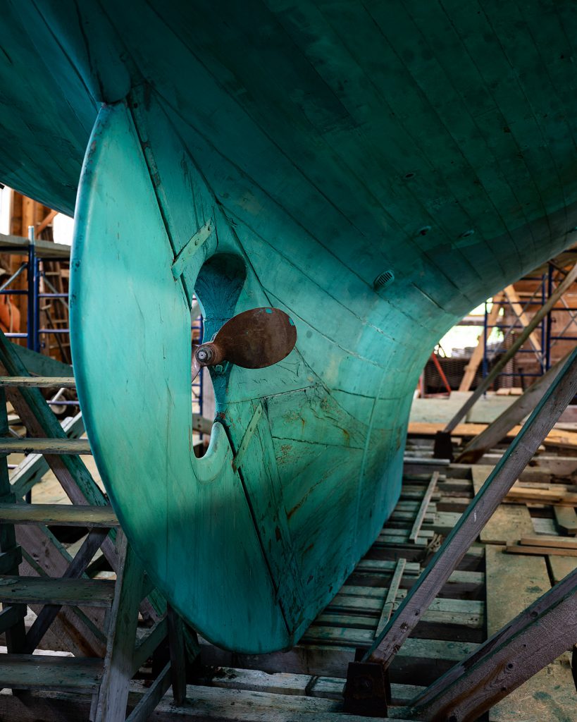 The hull of Dyon, a 100-year-old sailboat.
