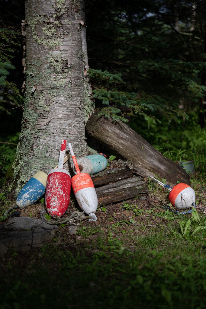 Lobster buoys scattered in the yard.