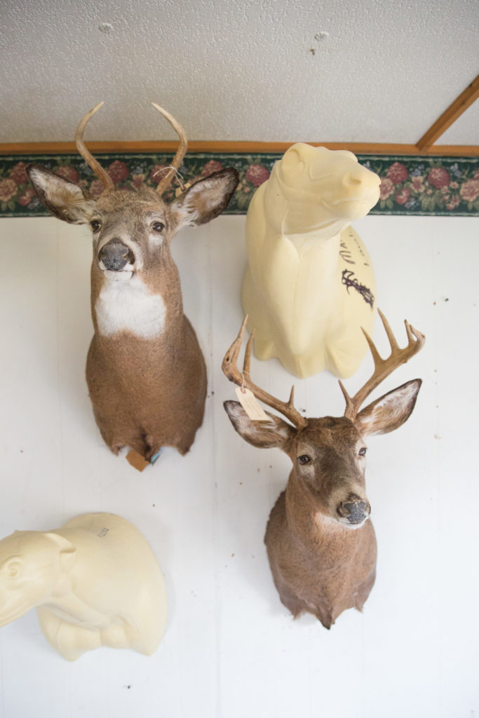 Molds and finished products in Steve Jandreau’s taxidermy shop in Portage.