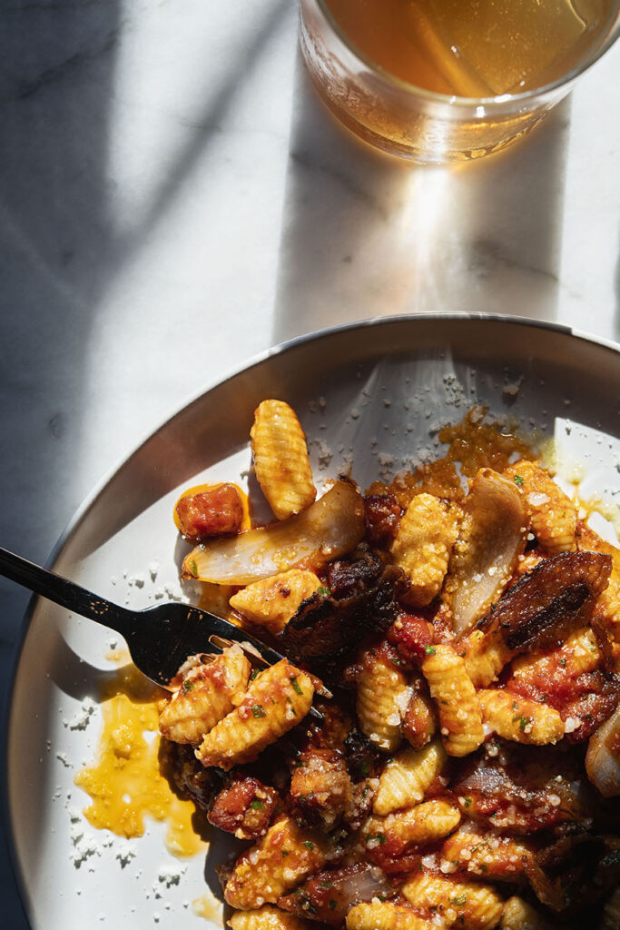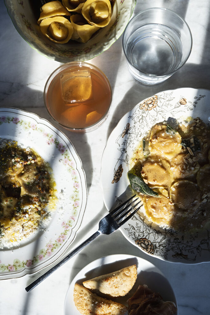 The kale and frisée salad acts as a nice palate cleanser between courses, with thick slices of pear and salty cheese that offset the bitter edge of the greens. The walnut vinaigrette delivers a pleasantly astringent finish to each bite. Next comes a round of pasta, thoughtfully offered in half and whole portions. The tortelloni en brodo is the standout. Bergin later tells me it’s a dish that he sees as an extension of himself, its intricate preparation embodying his appreciation for from-scratch cooking. “I’m not a flashy dude,” he says. “I really believe I was born in the wrong decade. I’m like a 70-year-old man in a 39-year-old’s body.” The mortadella-filled tortelloni come floating in a rich broth that takes seven days to make, each day bringing another round of clarifying and the addition of more roasted poultry bones. The result is swoon-worthy, delivering a depth of flavor that keeps me spooning up the broth long after the tortelloni are gone.
