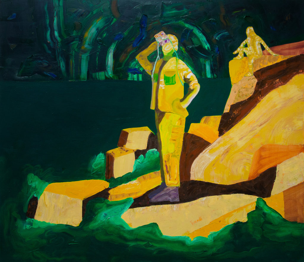 I make spooky landscape paintings populated with a cast of faceless characters. My works are derived from studies and sketches of coastal Maine, which becomes the setting for fantasy. My oil paintings are characterized by saturated, optical color work, an expansive vocabulary of mark-making, and lanky, ambling figures. By blending the historied Maine traditions of horror and landscape, I create scenes in which the body is a force within nature. The scenes range from moments of peril—passive subjects being touched, grabbed, and stepped on—to moments of force, where subjects are striking, lifting, and strangling. The faceless bodies contribute to the open narrative structure of the work—the lack of expression allows the figures to coolly disassociate from the proceeding activities. Self-possessed and self-aware, the paintings themselves gaze back toward the viewer.