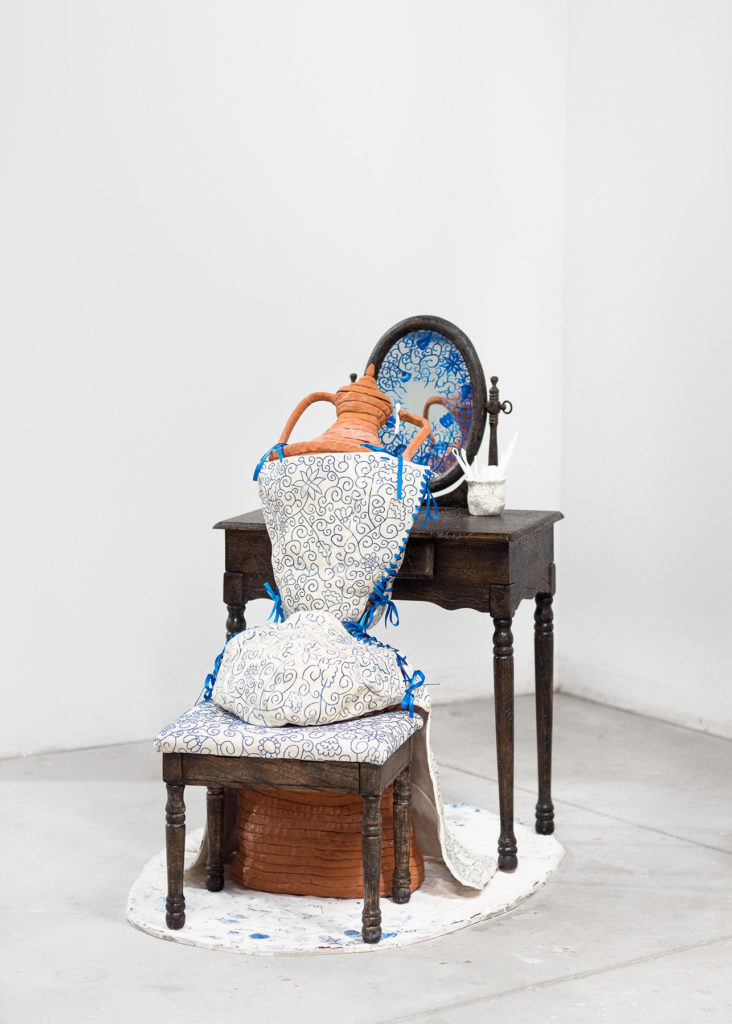 I mine the complicated and intertwined histories of ceramics and womanhood and their symbolic associations with refinement and “good taste.” My sloppy, anthropomorphic mimics of antique Wedgwood vases flaunt their costumed veneers of popular blue and white China patterns as they get dressed. Drawing from the historical canon of ceramics, the foundations of American morality, and the metaphor of “putting on a face,” and working in clay, cloth, and thread, I weave materials and histories of domestic life to name, dissect, and condemn the ways that white feminism benefits from and ultimately upholds white supremacy. I received my BFA in ceramics from the University of Texas at San Antonio in 2017 and my MFA in studio art from MECA&D in 2020. I live and work in Portland.