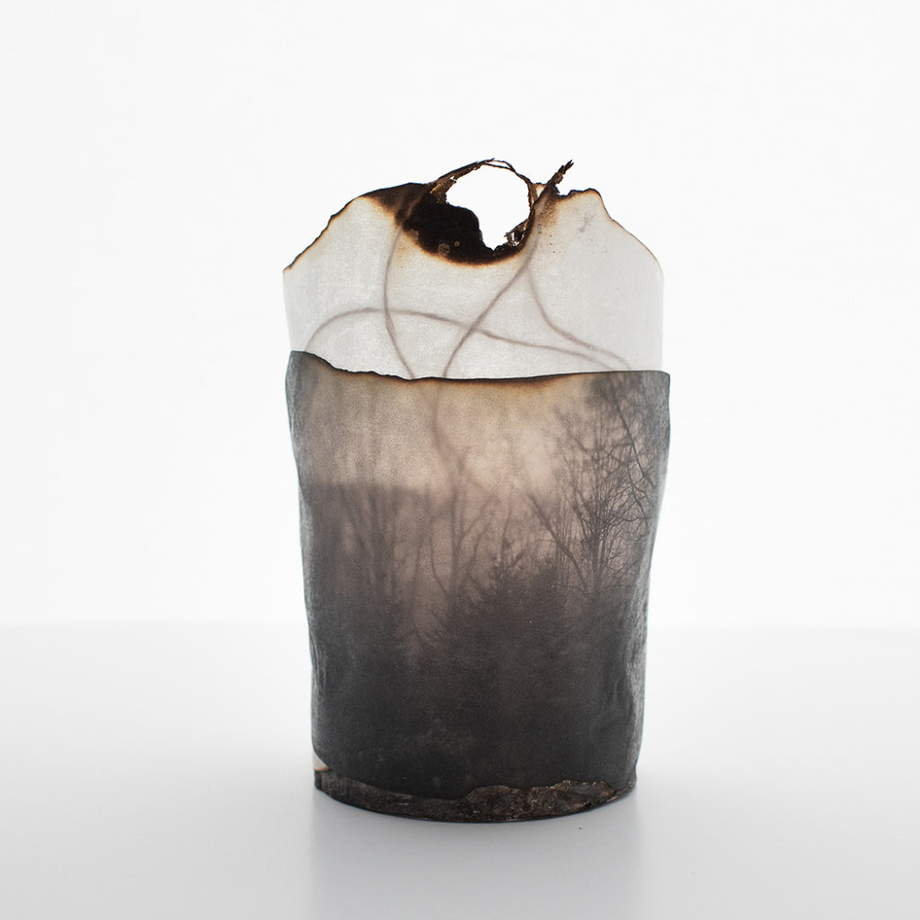 Pigment print on Kozo paper, mulberry paper, Davey board, natural fibers, PVA, and fire, 6″ x 4″ x 4″
