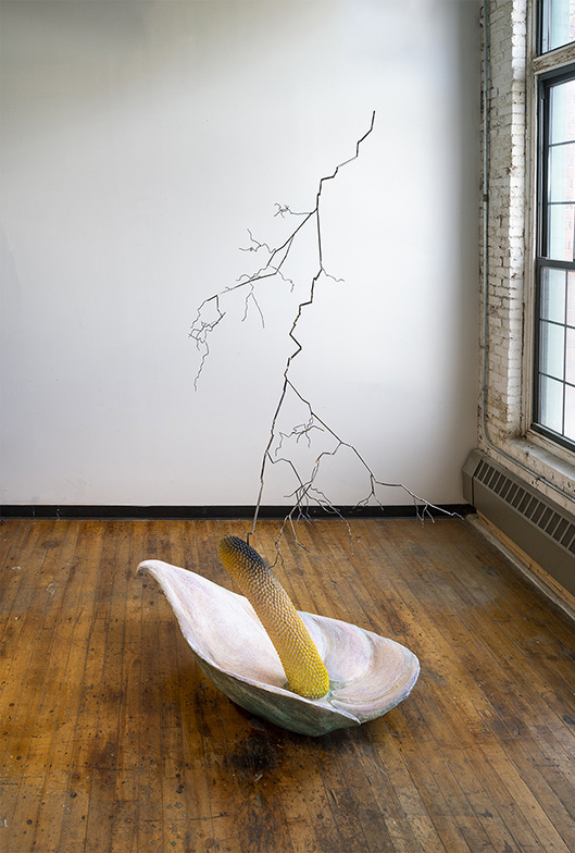 I am a sculptor interested in philosophies of queer ecology and humankind’s relation to nature. My content translates a yearning to reconnect with the natural world and make sense of it through the language of reflection, desire, and awe. My work intrigues yet confounds the viewer, evoking ripples of curiosity that invite them to consider their own relation to the natural world. I interpret nature through the queer lens, meaning “strange, odd, different,” while also utilizing tropes of queerness like campiness, sexuality, subversion, and counterculture. I work in a variety of materials, all centering sculpture as the manifestation of the themes I explore in which I offer a queer approach to a conjured, more collaborative future.