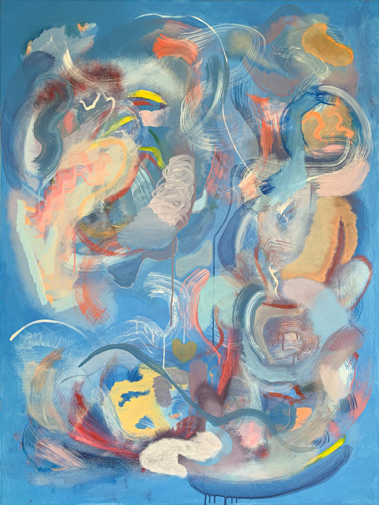My work is a representation of my escape from the metaphorical box I spent my childhood in. I grew up in a rural town in Vermont as one of the only people of color. I was frequently singled out for being one of the few Black people in my school and was known for being “slower” because of my dyslexia and slow processing speed. It was extremely difficult for my mind to follow conventional methods of learning, and I struggled in educational settings that demanded a standardized approach. My art is the liberation of my mind. I am allowing myself to embrace my own way of processing things and to forget about any normalcy I “should be” taking part in. There is no planning behind any of my pieces, only guidance from my present emotions. I make each mark as an intuitive response to the relative state of the canvas. This process is my therapy and a commitment to honoring my mind and the way it thinks.