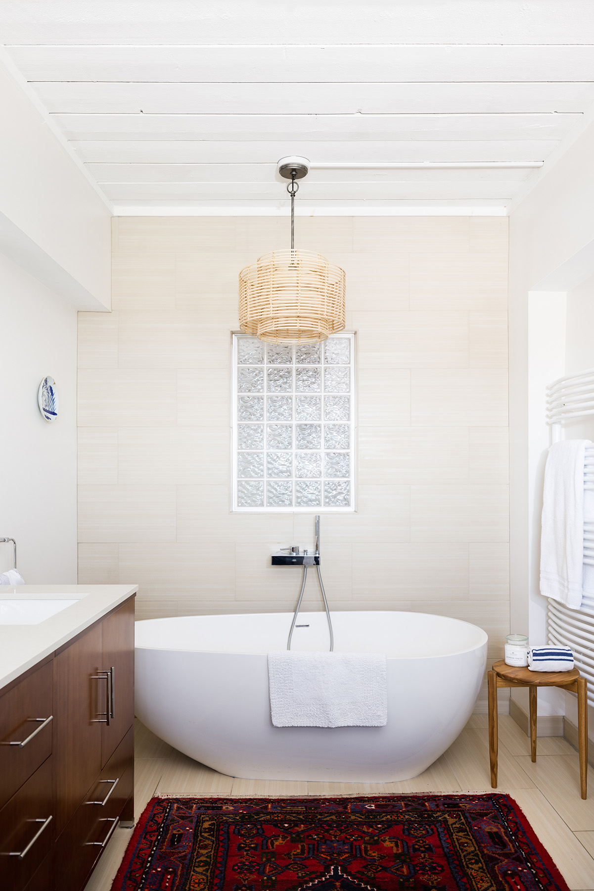 One of the first things Fletcher and Michael did to put their stamp on the house was to add an exterior entrance to the roof deck, the spot they fell in love with in the first place. “When we bought the house, we had to go through the pool house bedroom to access it,” says Michael. “Which is where my 17-year-old sleeps but doesn’t appreciate it,” he adds with a laugh. This meant that, to share the incredible outdoor location with their friends, the couple had to drag them through their daughter’s bedroom. “Believe it or not, that deck ended up barely being used,” Michael says. Since the roof itself needed replacing, they went ahead and redesigned the deck: bigger, with modern horizontal cable railing, and a stair down to the patio so that people can access it from below.