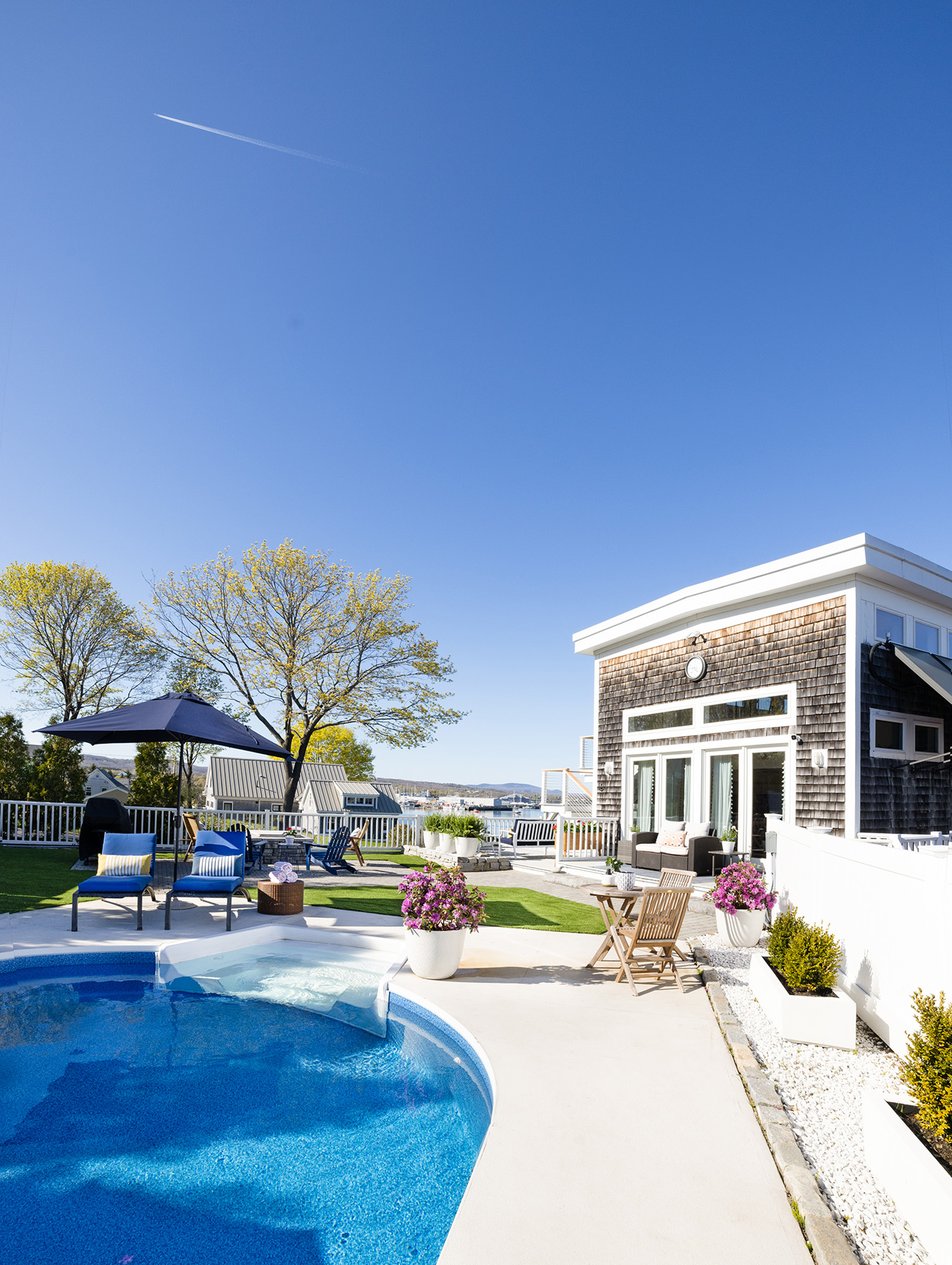 Michael and Fletcher and their family of three girls moved into the house in August 2020, when the new normal meant many people were living all aspects of their lives—work, school, family— in one place. “We didn’t know what was going to happen with the pandemic,” says Michael. “We knew we could be on lockdown like other countries were doing.” But the house was everything they could have wanted—an oasis of peace and tranquility during that time. Between the pool and hot tub in the backyard, the family’s power boat—a Legacy 34 called Willowmere— docked just a five-minute walk away, and a three-story addition they refer to as the pool house, they could enjoy themselves without leaving home while still allotting everyone their own territory. “The kids can be watching Saved by the Bell in one room, and we can be watching Ozark in the other room, and no one would know,” says Michael.