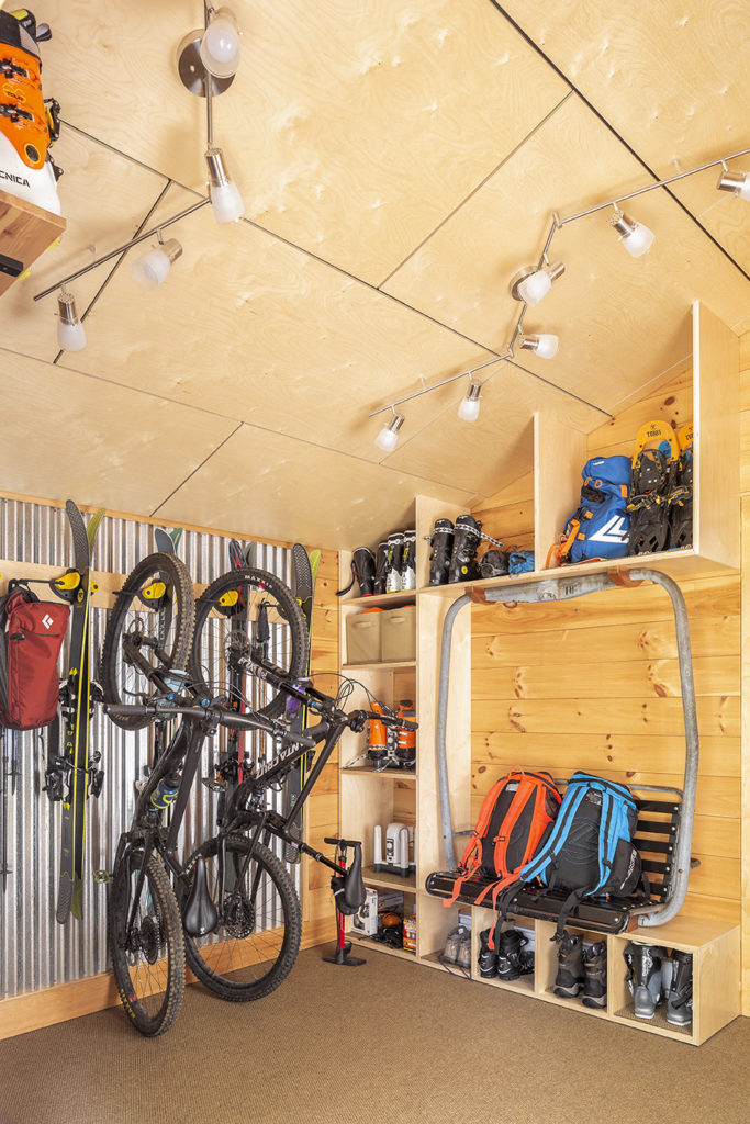 The mudroom features racks for bikes and skis, cubbies for boots and gear, and