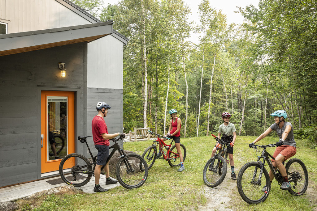 “The big thing we did to the original house was to add a 10-by-10 mudroom off the driveway side. Before, it was just a three-story wall with a stair that went up to the second-floor entrance. Adding the mudroom really helped give the house a little more curb appeal. Plus, people would just come in and drop everything—bags and shoes and gear—in the living room. I had a good friend of mine, Brian Stearns of Stearns Woodwork, build it, and he also installed the bench and built-ins surrounding it. We use the house just as much in the summer as we do in the wintertime, for mountain biking and hiking, so the room had to be able to hang bikes on the wall in the summer and skis in the winter, and to store all the different boots that go with all the different types of skiing that we do. It’s great, just having that extra entry space and a place to take your shoes off.”