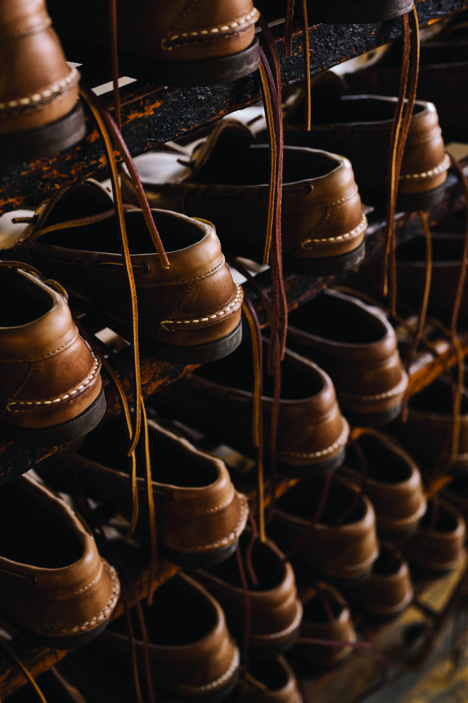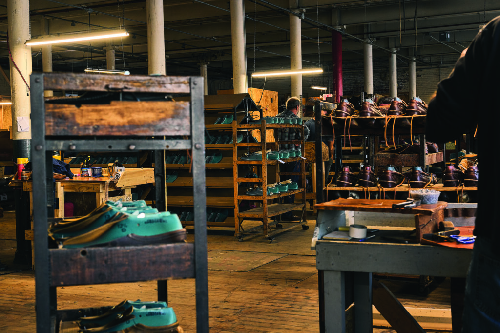 Dorman meets me at the loading dock and ushers me past a “passenger use prohibited” sign and onto a freight elevator. The clanking green metal doors close, then open, and as we step out onto the sixth floor we are staring down the vanishing point of a vast and very empty hallway a hundred or so yards long. Cheerily, Dorman walks all the way down to the hallway’s other end, turns left, and opens a door. Inside is Easymoc, an independent shoe company that was founded by a 34-year-old but bills itself as old-school. In here, the industry’s past orchestral scale has been arranged for a string quartet: there’s the percussive tap of the machine sewer, the rough brush of sandpaper on an insole readied for glue, the rumble of the air compressor in a heel laster. And then, above it all, the elegant thwip sound of a hand-sewer’s needles pulling waxed thread through leather, time after time.