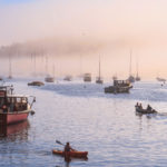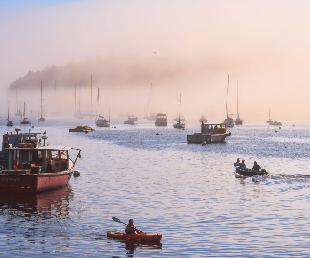 Living on Bald Mountain in Camden, I enjoy a bird’s-eye view of the weather advancing toward and retreating from Camden and Rockport harbors. On this particular day the atmosphere was wildly changeable, the fog rolling in at a swift clip and swallowing boats in its way. I got to Rockport Harbor just before the fog gulped it all down. Warm and cold air colliding can be stunning. The kayaker hugged the harbor while the little motorboat sped ahead toward the mystery. I too choose to shoot in that mystery of fog, mist, and rain.