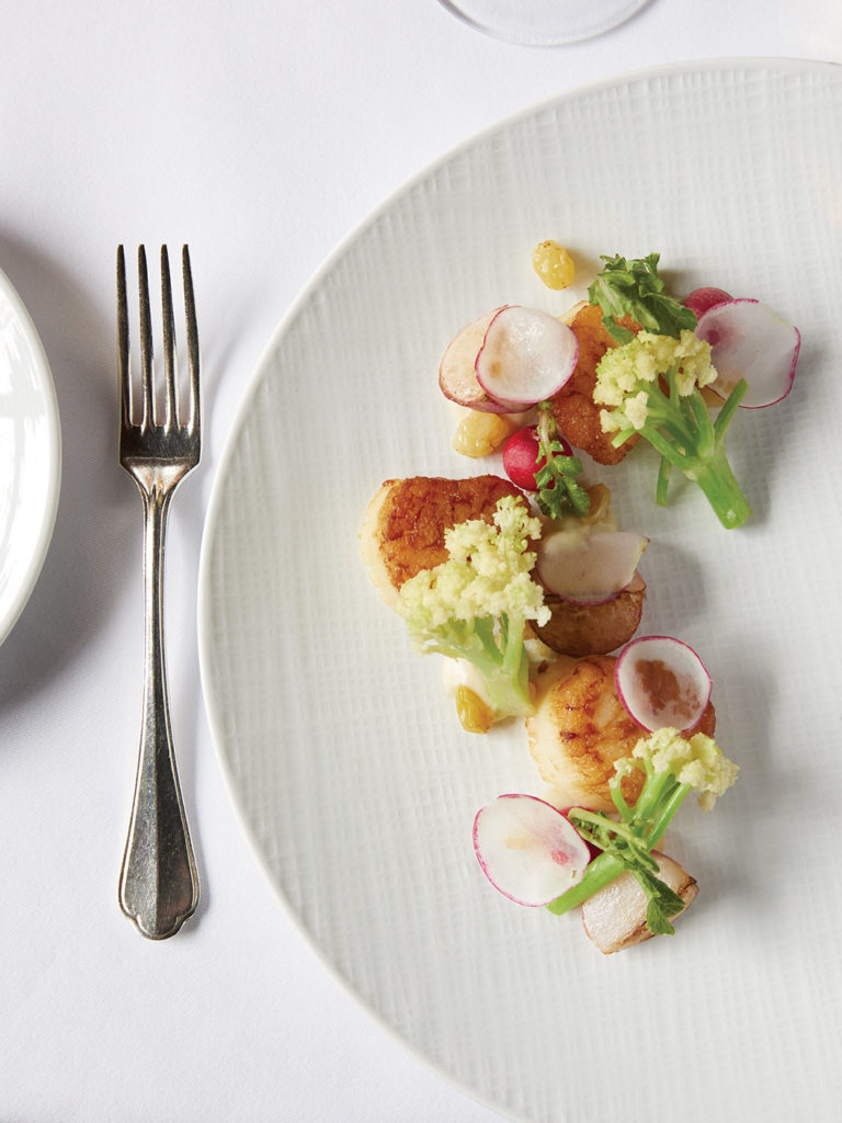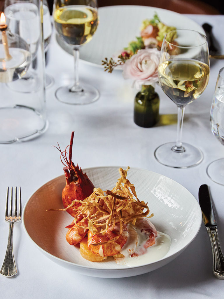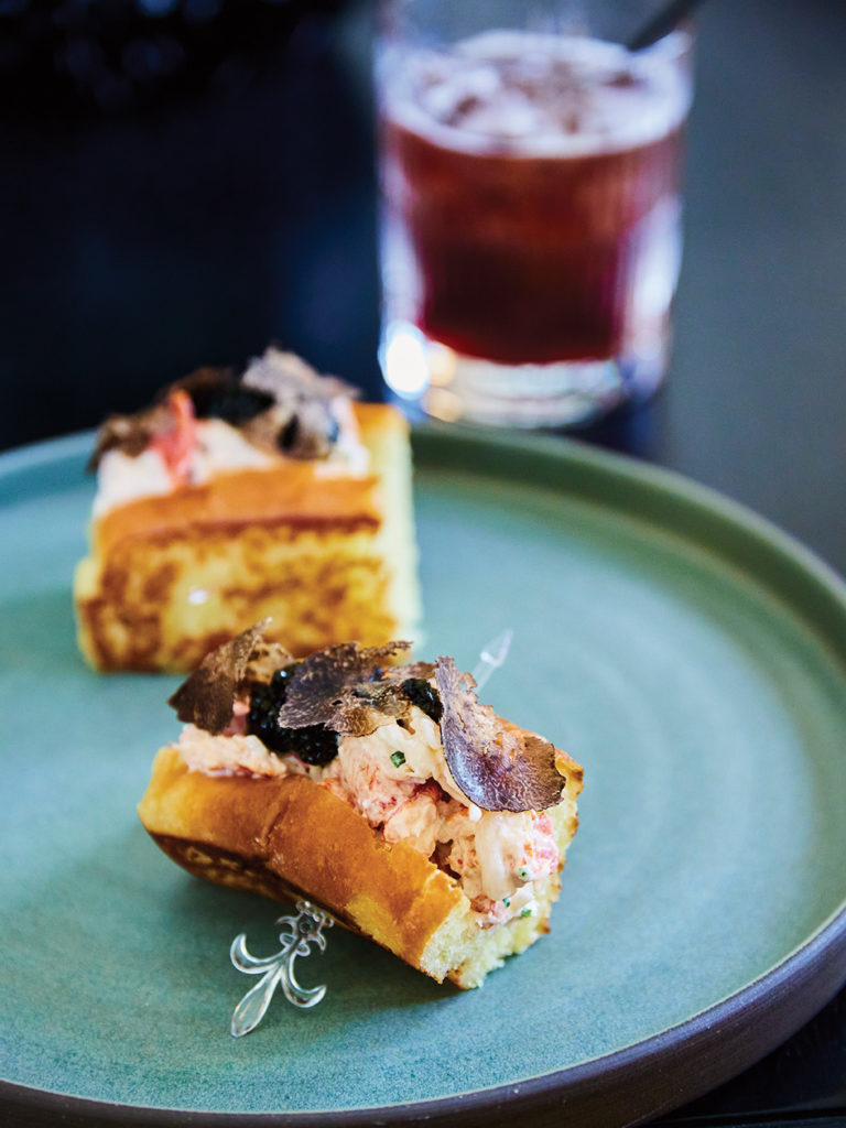 Shortly after we arrive, we’ve got spirit-free libations in hand and executive sous chef Wilson Suliveras stops by our fireside parlor seats with a tray of mini lobster rolls as a preview—each is a lobster bite on toasted brioche topped with caviar, truffle, and the tangy zip of rice vinegar mayonnaise. Originally from Puerto Rico, Suliveras trained at the Culinary Institute of America in New York and is known to be particularly good at pastas. Now I can’t wait for dinner. We have reservations at the restaurant for the following night. (Since our visit, Mathew Woolf has arrived to helm the kitchen at the White Barn and Little Barn. He moved to Maine from New York City, where he was the executive chef and pastry chef at the Rainbow Room, after beginning his culinary career in London.)