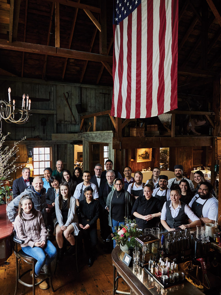 When it’s time to dine again, we’re headed for a lamplit table in the barn, to experience some of the traditions and flavors that have brought the White Barn so much acclaim. The specialness begins as soon as we sit down and get a close-up view of the rooster sculpture on the table—it’s made completely from fine silver cutlery, a work by French sculptor Gérard Bouvier. Each table is adorned with a similar custom piece. (On other tables are the glimmering forms of other roosters and wild-life, including toucans and crabs.) Chris Bayley, our table’s server, shares that it’s his twenty-ninth year at the White Barn, and he explains that the sculptures have been a guest favorite for decades. From a wine cellar of about 500 bottles, he pops open a bottle of Veuve Clicquot champagne as we settle into the prix fixe menu—guests choose either four courses or a six-course lobster-focused menu. We taste seared scallops arranged with slivers of radish, a creamy butternut squash soup topped with pepitas, and tender tagliatelle pasta with Maine lobster. From a tour of the wine cellar—and a wonderful glass of cabernet franc—to coffees with the S’mores Baked Alaska dessert, it’s a night of indulgence and high service, including a visit from the sous chef, checking in at each table mid-meal.