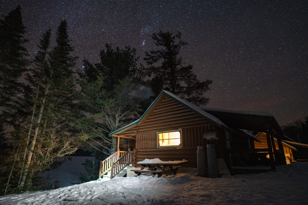 At Kidney Pond, the accommodations are a few notches up from Evan’s tarp in the snow. We’re staying in a rustic cabin lit by gas lamps and heated by a woodstove. Mark has made chicken tikka masala for dinner, and the sauce drips down our chins as we shovel steaming spoonfuls into our mouths, packing in extra calories in anticipation of a cold night. When we go outside to fetch water from the hole we’ve chipped in the pond, the sky has cleared and billions of stars settle over us like a curtain, glittering somehow brighter in the cold air.
