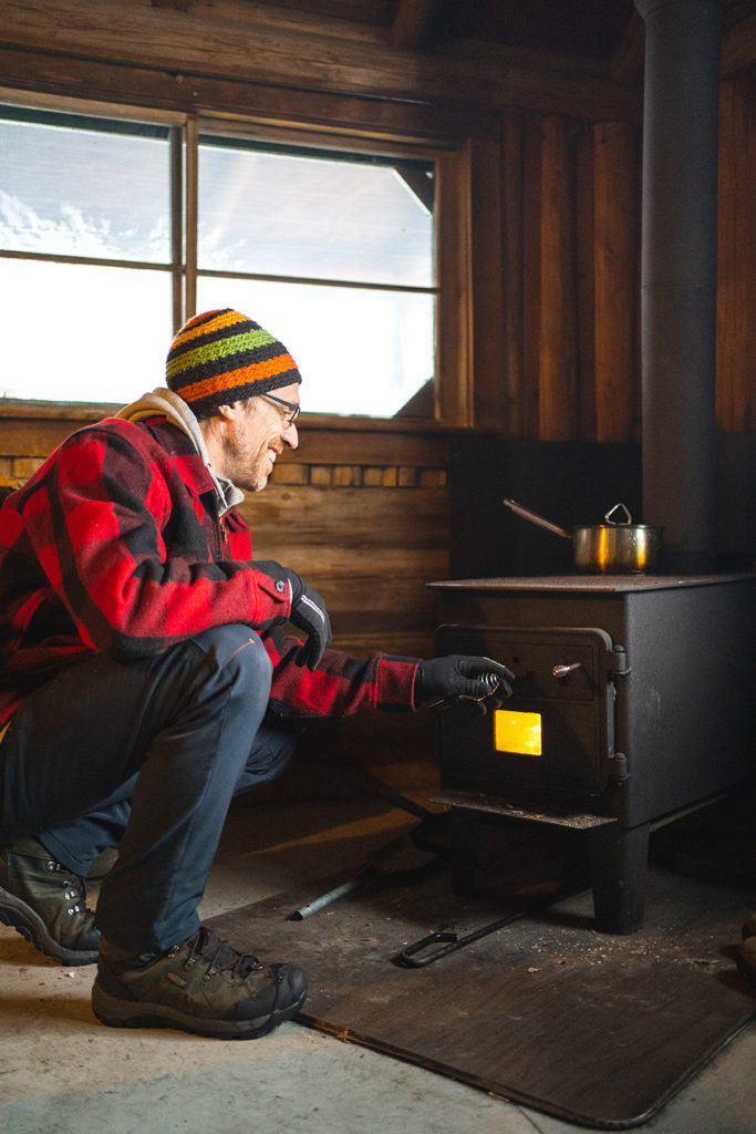 In the morning, the world looks brand-new, coated in two feet of fresh powder. We stoke the fire and make a plan. If the wind dies down, we’ll cut across the pond; if it doesn’t, we’ll stick to the trees and take the long way back to the car. It calms down just before we’re ready to leave. Sun sparkles on snow as we break trail across the frozen water.
