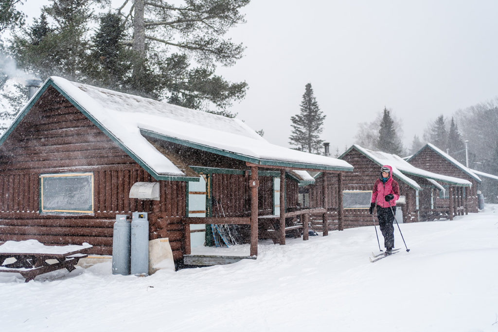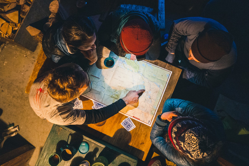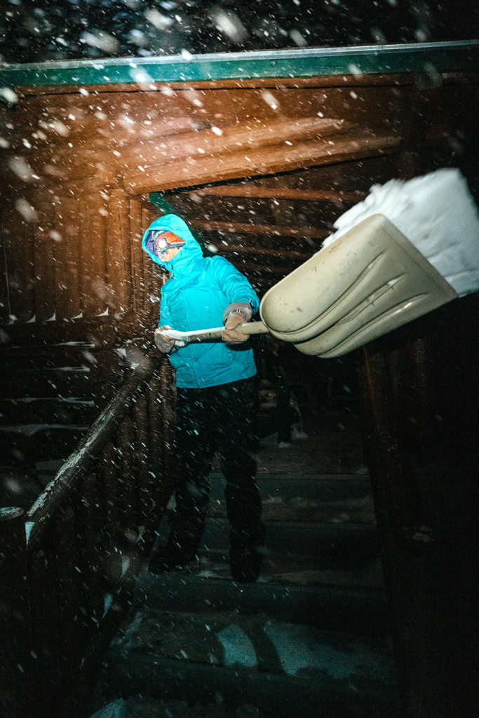 After coffee the next morning, we take a Spikeball net out to the middle of the frozen pond and play, diving into the snow after a little yellow ball, until the sky fills with clouds and the storm rips in. It is, as promised, a big one: fat white snow flurries and howling wind. We strap on skis and snowshoes and walk out into the melee until the visibility drops and our cheeks are numb, then we turn and head for shelter. That night, we encounter the most unnerving task of the entire trip: finding the outhouse 40 yards away in the pitch-black during a blizzard. We have to get fully suited up just to pee. The snowdrifts are chest-high. Then we lie on our bunk beds with our eyes squeezed shut, pretending to sleep as cold, powdery snow drifts through the cracks in the log cabin and settles on our faces.