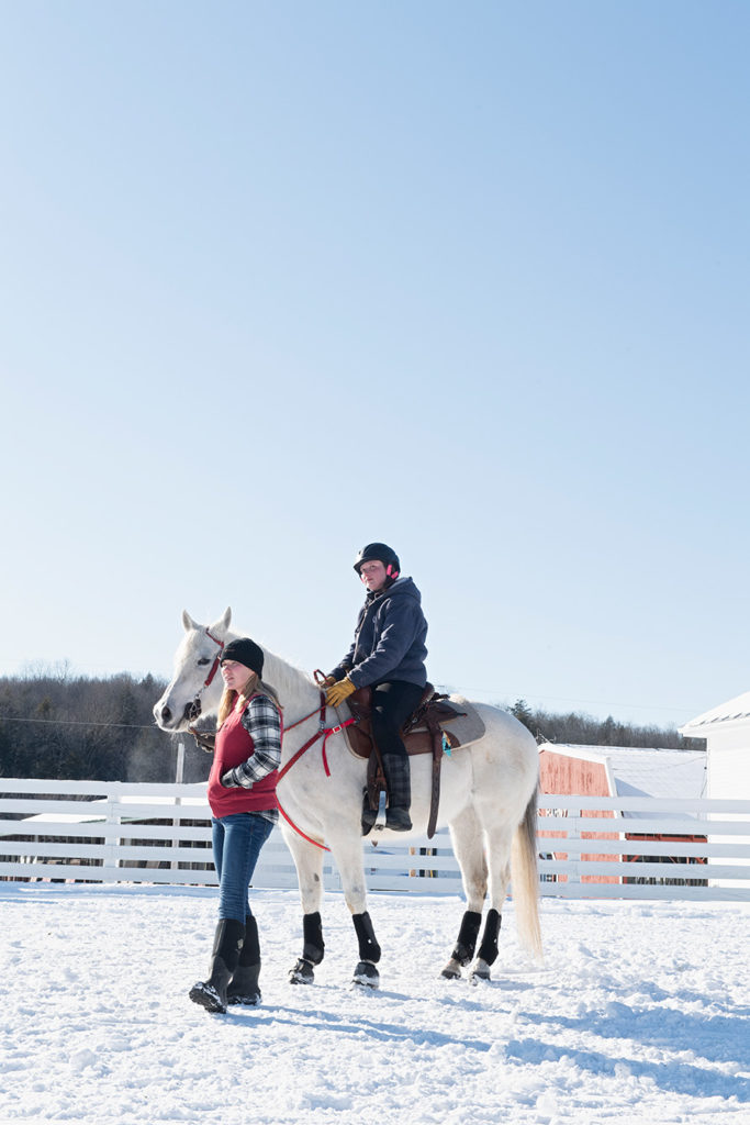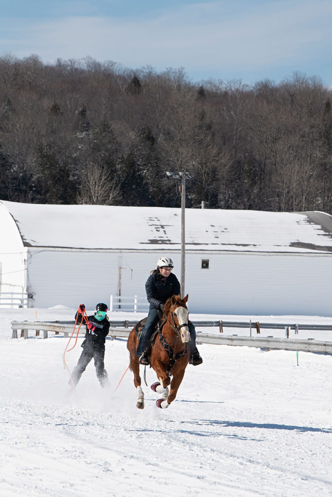 When most racers and their horses arrive this morning, the temperature is in the single digits. Some horses are standing outside their trailers in the parking lot, getting acclimated to their surroundings. For animals that haven’t raced before, this may be the first time seeing people on skis or wearing goggles.