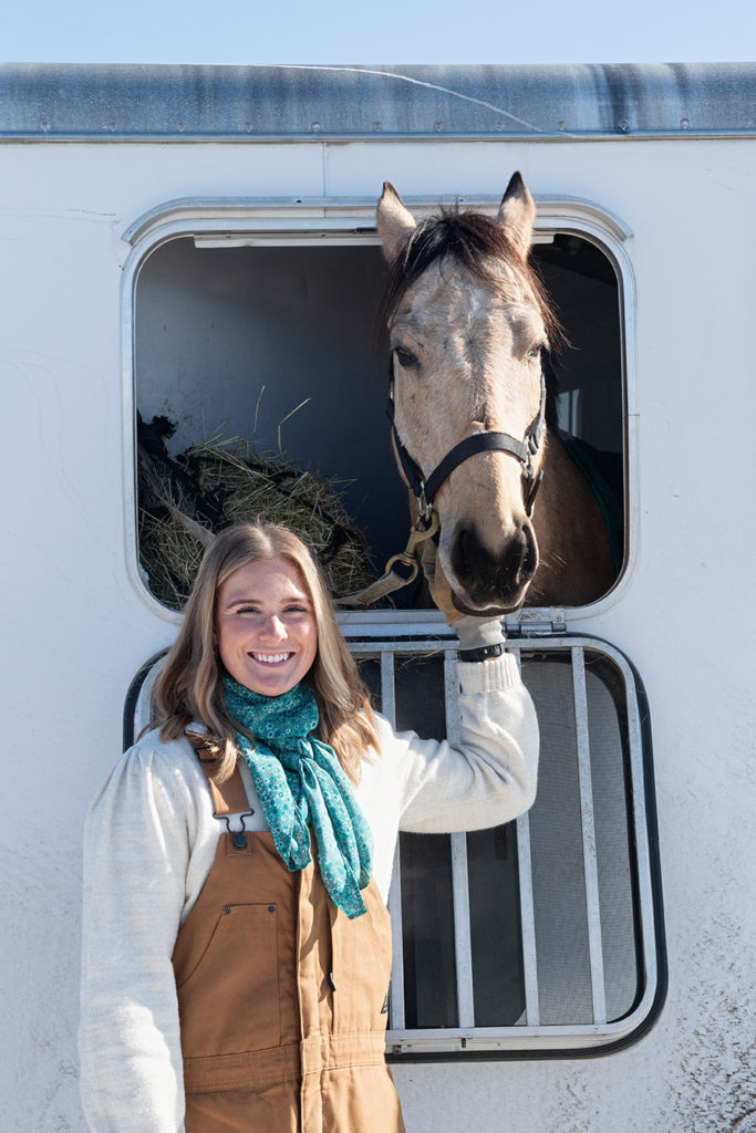 Hannah Novaria is riding Kazuki, a tan horse still in its trailer, and will pull her uncle, Bill Poulin. Novaria and Poulin have been racing in the Skijor Skowhegan since its inaugural year in 2019. Just a couple weeks before this race, they finished second in the Topsham Fair Association’s first skijoring event.