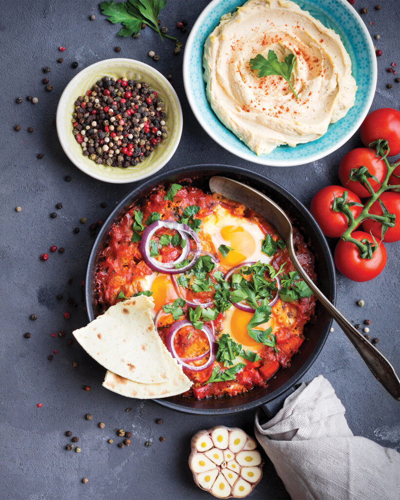 Shakshuka is an easy, fragrant, and healthy breakfast dish. It’s as simple as simmering tomatoes, onions, garlic, and spices and gently poaching eggs in one pot. Enjoy with pita or a baguette, plus, the aroma is certain to get your