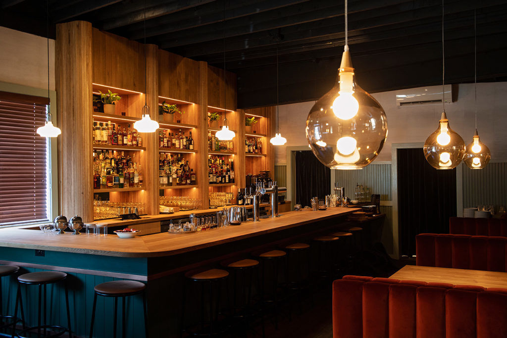The Danforth’s bartenders begin pouring drinks at 4 p.m., so I arrive at the Portland cocktail bar at 4 o’clock on the dot for an early happy hour. As I step through the restaurant’s front door toward the host stand, the afternoon sun is streaming through several large windows, illuminating the space that has been recently renovated into a posh, modern lounge. One wall of the bar area is lined with three plush, dark red velvet booths, while 12 backless barstools provide seating at the blond wooden counter. Midcentury modern glass pendant lights hang overhead, drawing the eye toward the sleek wooden shelving that showcases an extensive liquor collection.