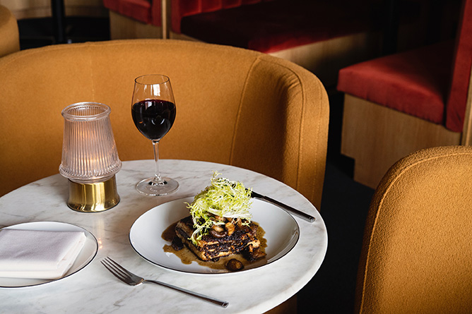 The food at the Danforth is another surprise, revealing a depth I didn’t anticipate from an establishment that is primarily a cocktail bar. Chef Michael Boomhower, most recently of Central Provisions in the Old Port, offers a robust menu of nine share plates and five large-format entrees. When I return for dinner, my husband and I are seated in the lounge, a room adjacent to the bar that seats 75 in burgundy velvet booths and clusters of mustard-yellow swiveling barrel chairs. The mood in the lounge is energetic as our upbeat server delivers a parade of small plates. I sip an Echelon, a riff on a margarita made slightly savory by the addition of celery juice and sesame, and dig into the campanelle pasta, each bite coated in a radish-greens pesto that leaves a lingering spiciness.