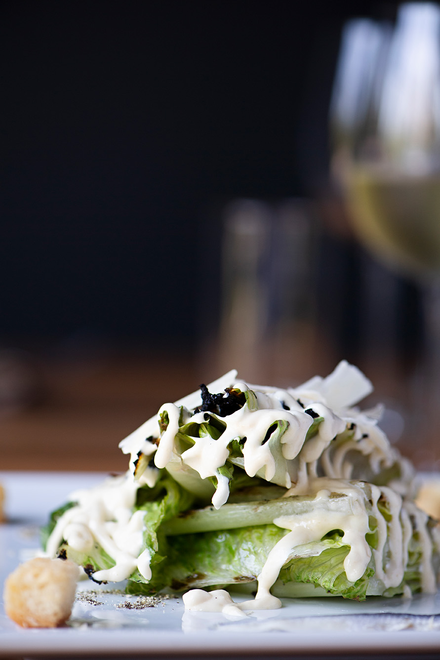 As I enjoy a slice of the housemade bread, served warm and slathered with delightfully salty chive-lemon butter, I see grilled Caesar salad and steamed mussels on the menu. The two dishes were staples at Five Fifty-Five, so I order both to begin the meal. The salad, which comes thoughtfully split between two plates after our server hears that my husband and I plan to share it, delivers a slightly smoky char from the grilled romaine and a classic creamy dressing with plenty of lemon. The meaty Bangs Island mussels are surrounded by a garlicky broth spiked with pickled cherry peppers that lend a pleasant heat.